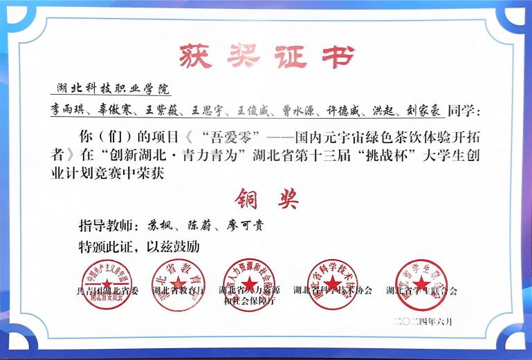 2024年湖北省第十三届“挑战杯”大学生创业计划竞赛铜奖(2023级刘家豪指导教师:苏枫、陈蔚、廖可贵)