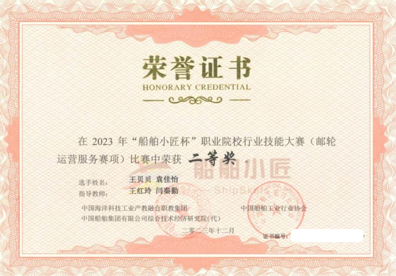 2023年“船舶小匠杯”全国职业院校行业技能大赛(邮轮运营服务赛项)二等奖(2022级袁佳怡、王贝贝 指导老师:闫秦勤、王红玲)