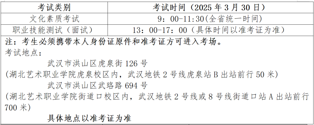 考生参加我校自主命题文化素质考试,考试内容包括语文、数学、英语三门科目(合卷,不分文理科),命题依据为中职学校语文、数学、英语课程标准及各招生专业实际要求,本项考试及评分受湖北省教育厅、湖北省教育考试院指导和监督。