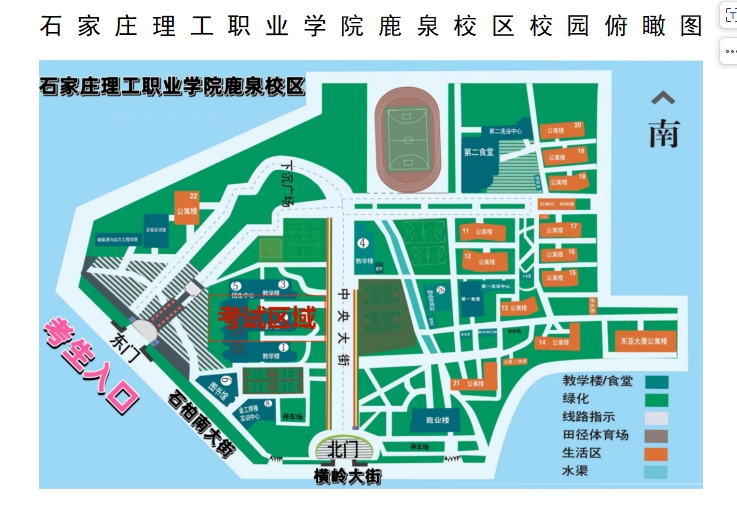 石家庄理工职业学院鹿泉校区(从石家庄理工职业学院东门进入。地址:石家庄市鹿泉区中山路西端转石柏南大街178号,325路公交终点站)。