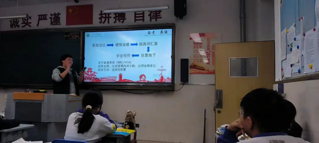 由于高三生这个群体的特殊性,高考在即,在宣讲时,邵明博同学首先针对即将到来的期末考试以及一百多天以后的高考,向学弟学妹们从备考和应考两个方面提出了一些建议并为他们加油打气;