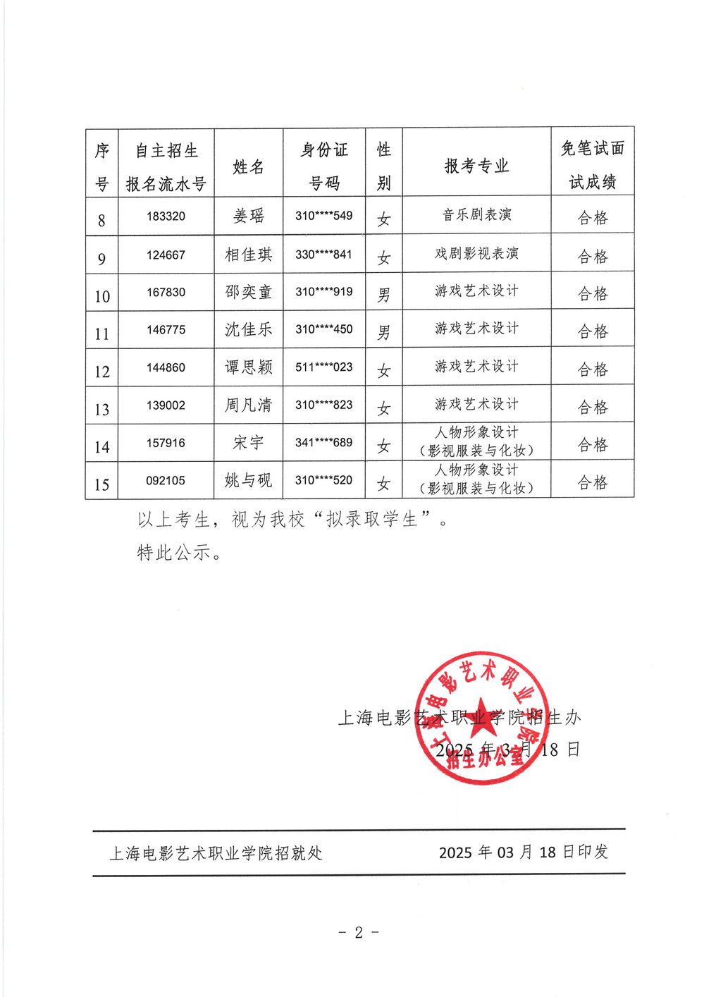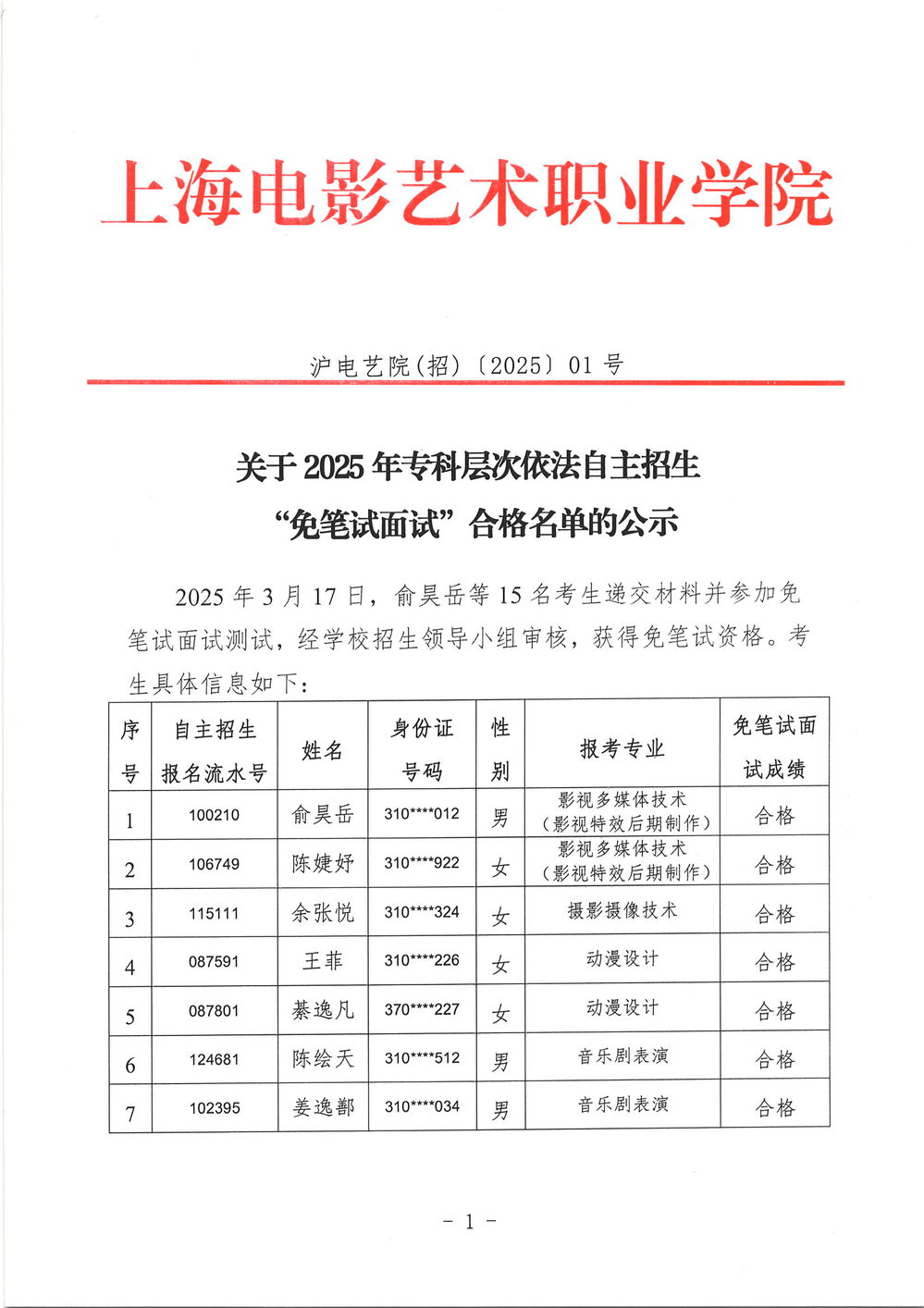 2025年 上海市专科层次依法自主招生 “免笔试面试”合格名单公示