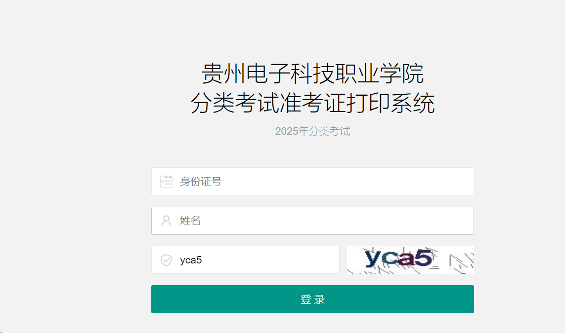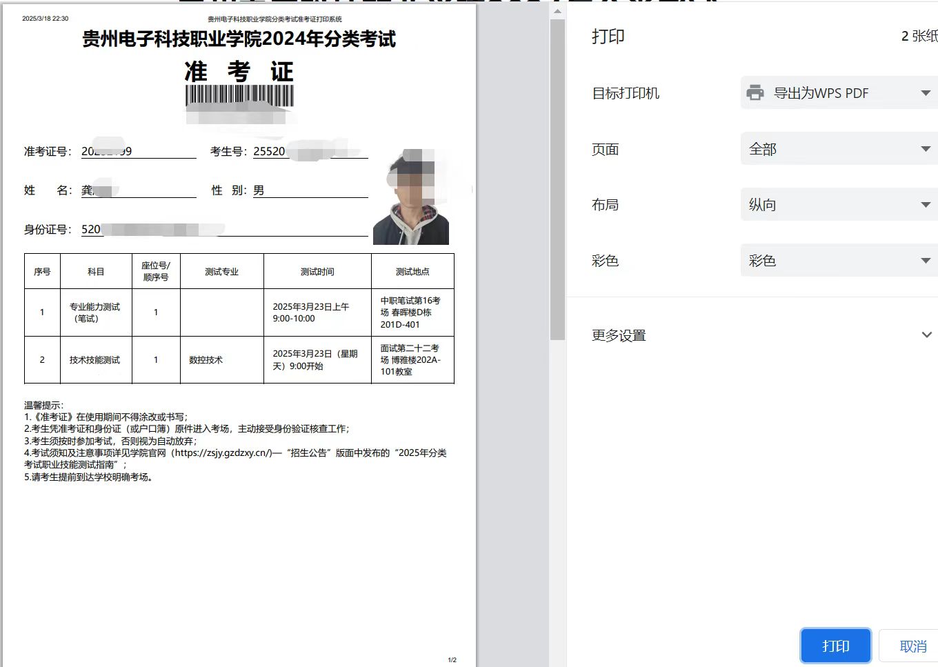 二、考试前准备1.明确自身考试资格。考生可在学校招生网站(贵州电子科技职业学院招生网 http://zsjy.gzdzxy.cn/)“招生公告”中查询符合录取资格的名单。2.查询题库备考。贵州电子科技职业学院2025年分类招生考试“职业技能适应性测试”考试大纲(高中类、专项类)在学院官网https://zsjy.gzdzxy.cn/info/1023/1393.htm“招生公告”中查询。贵州电子科技职业学院2025年高职(专科) 分类招生考试技术技能测试考试大纲(中职类)在学院官网https://zsjy.gzdzxy.cn/info/1023/1394.htm“招生公告”中查询;贵州电子科技职业学院2025年高职(专科) 分类招生考试专业能力测试题库(中职类)在学院官网https://zsjy.gzdzxy.cn/info/1023/1395.htm“招生公告”中查询。3.打印准考证。我院2025年分类考试招生职业技能(适应性)测试准考证领取,采取网上打印方式。请各位考生于2025年3月21日前登录以下网址http://120.76.139.117:8080/gzdzkjzy/,输入身份证号、姓名、图形验证码即可打印准考证。