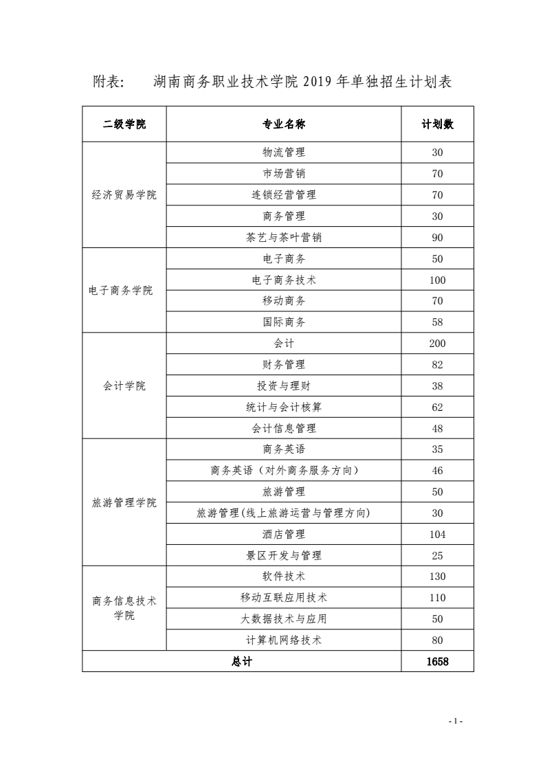 湖南商务职业技术学院2019年单招计划表