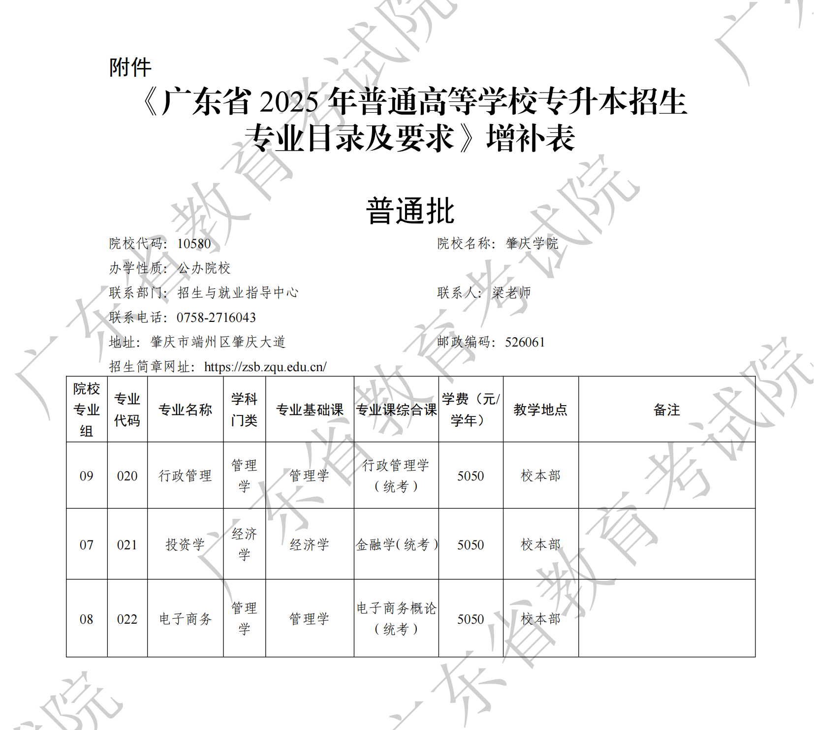 应有关高校要求,现对《广东省2025年普通高等学校专升本招生专业目录及考试要求》部分内容作如下增补(见附件)。附件:《广东省2025年普通高等学校专升本招生专业目录及要求》增补表广东省招生委员会办公室2025年3月17日