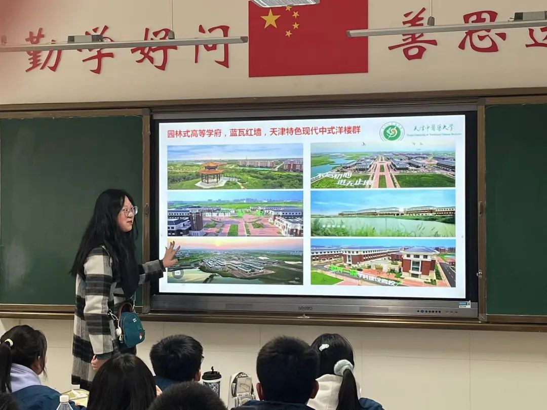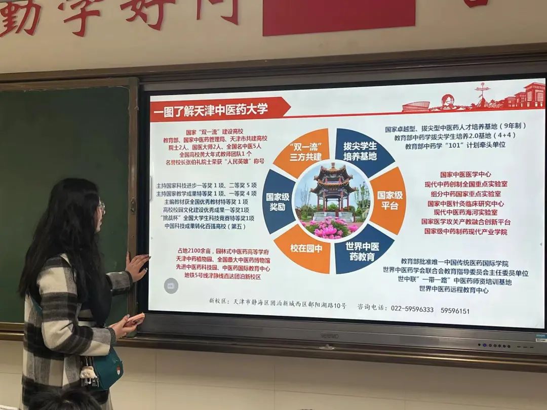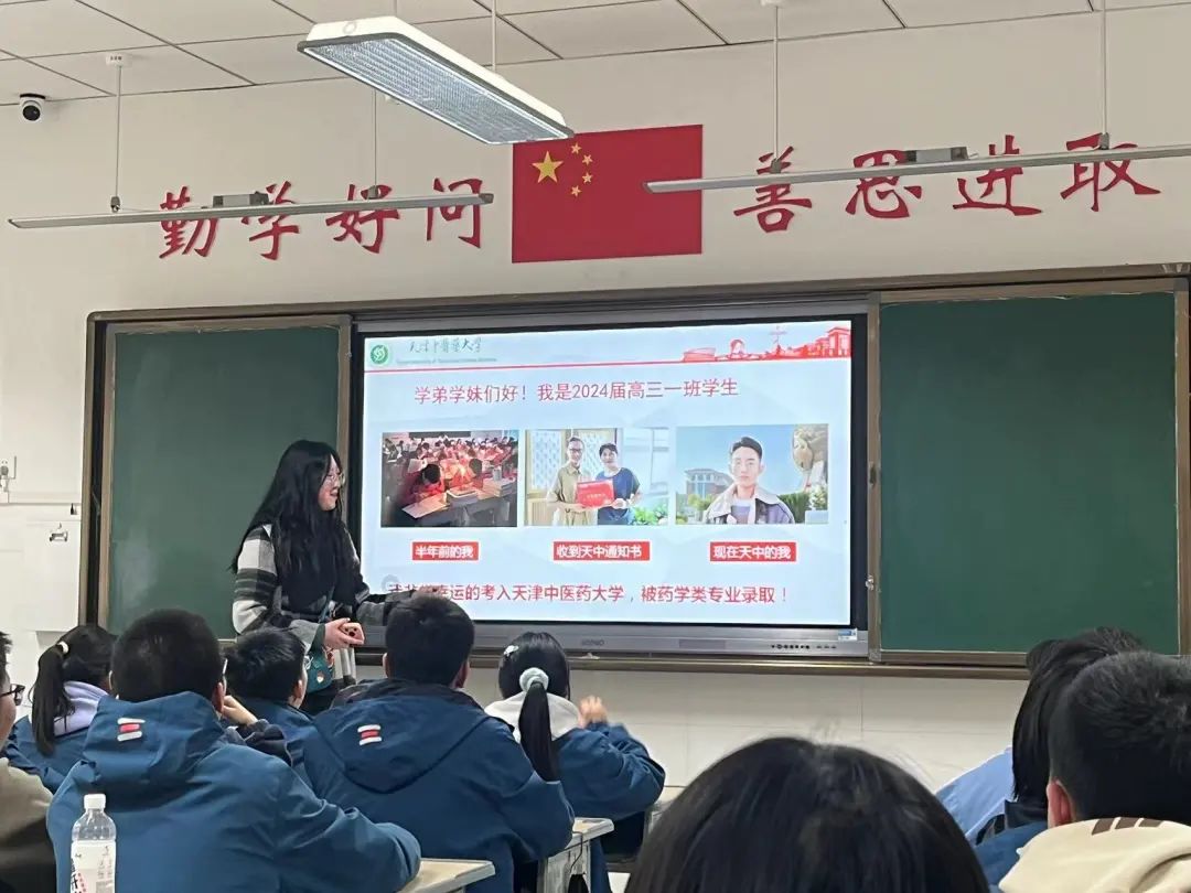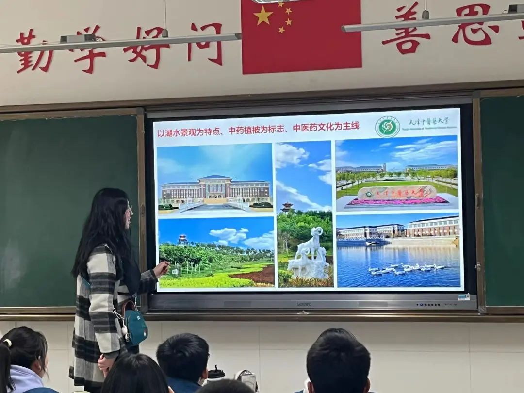 随后,学子们走进教室,与学弟学妹们进行了面对面的交流。他们分享了自己的大学生活,讲述了在天津中医药大学的学习经历和成长故事,鼓励学弟学妹们努力学习,追求自己的梦想。学子们的真诚分享赢得了学弟学妹们的阵阵掌声。