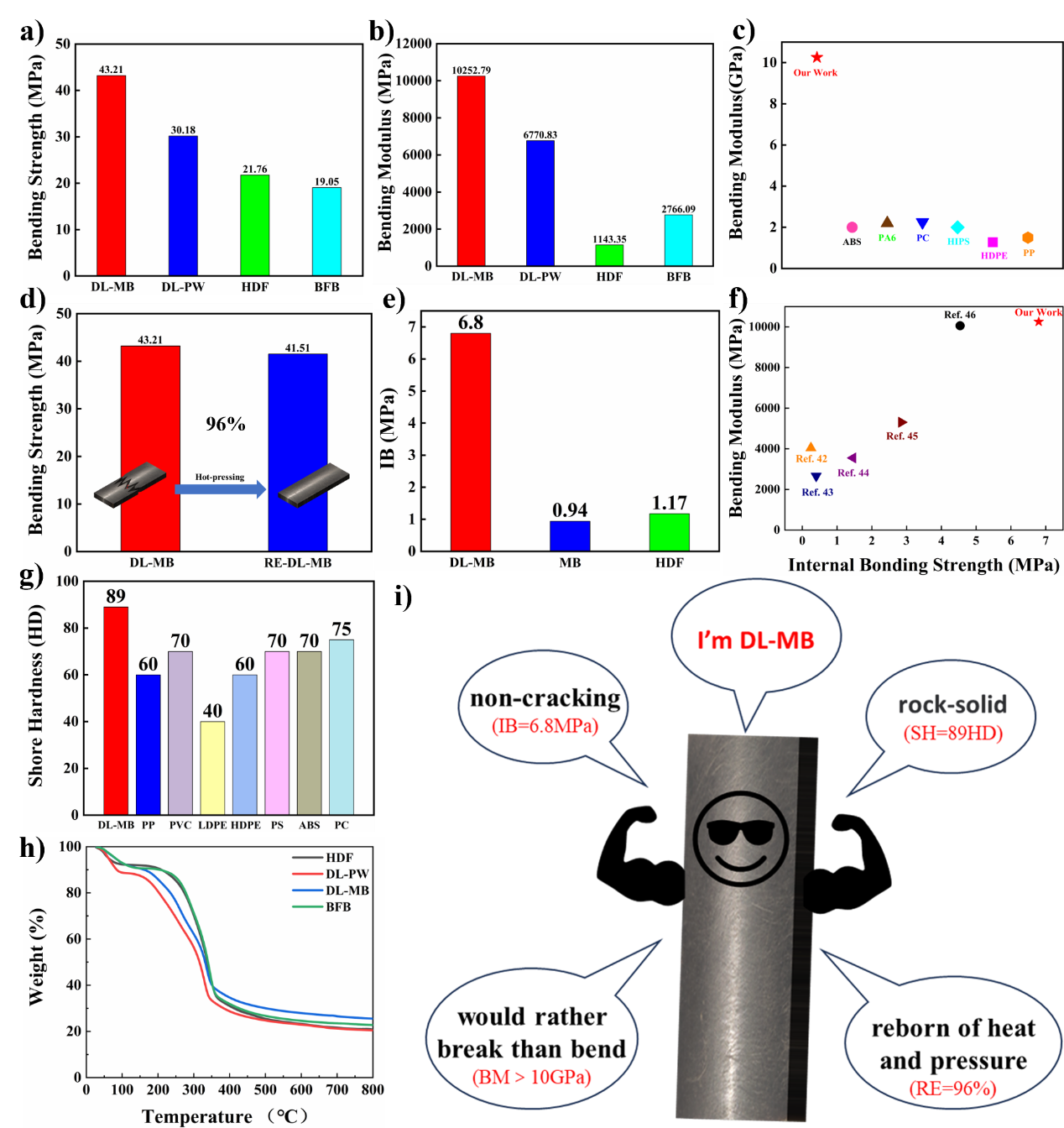 2022年6月举行的全球发展高层对话针对目前面临的不可生物降解塑料问题,提出了“以竹代塑”的重要课题,引起了广泛关注,特别是中国也将此项工作列入重点。但其中一个需要迫切解决的突出问题是寻找绿色的粘合剂。酚醛树脂、脲醛树脂等主流胶粘剂中含有有害物质。开发环保且经济有效的粘合剂至关重要。课题组利用均来自生物质的木质素和香草醛为原料,合成了一种新型的木质素基绿色粘合剂,实现了对竹子的特殊粘合强度。与传统的替代品相比,它可以与竹粉高效结合,制备的材料具有低成本、高机械强度、保温、防水、抗霉、和长期生物降解性特性,特别是得到板材的力学性能全面超越目前市场上常用的各种塑料产品(图4),为真正实现“以竹代塑”提供了新的解决方案,该成果近期发表于化工专业顶级期刊《化学工程杂志》(Chemical Engineering Journal,Chem. Eng. J.)。原文链接:https://www.sciencedirect.com/science/article/pii/S1385894725023307。