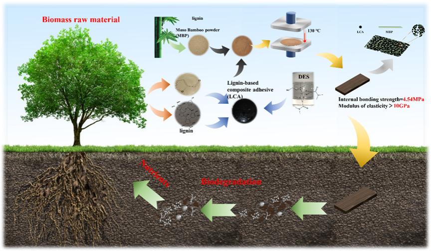 图4.采用木质素和香草醛为原料合成的绿色粘合剂及其用于竹粉制备板材的性能