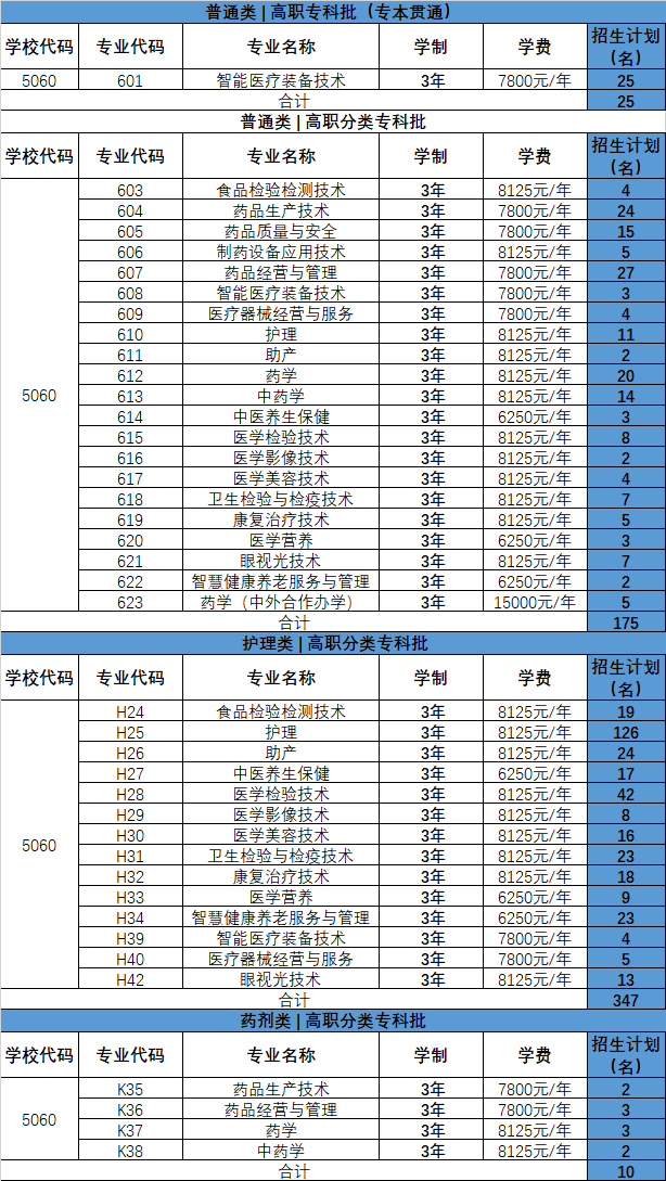 重庆医药高等专科学校2025年重庆市高职分类考试招生计划表