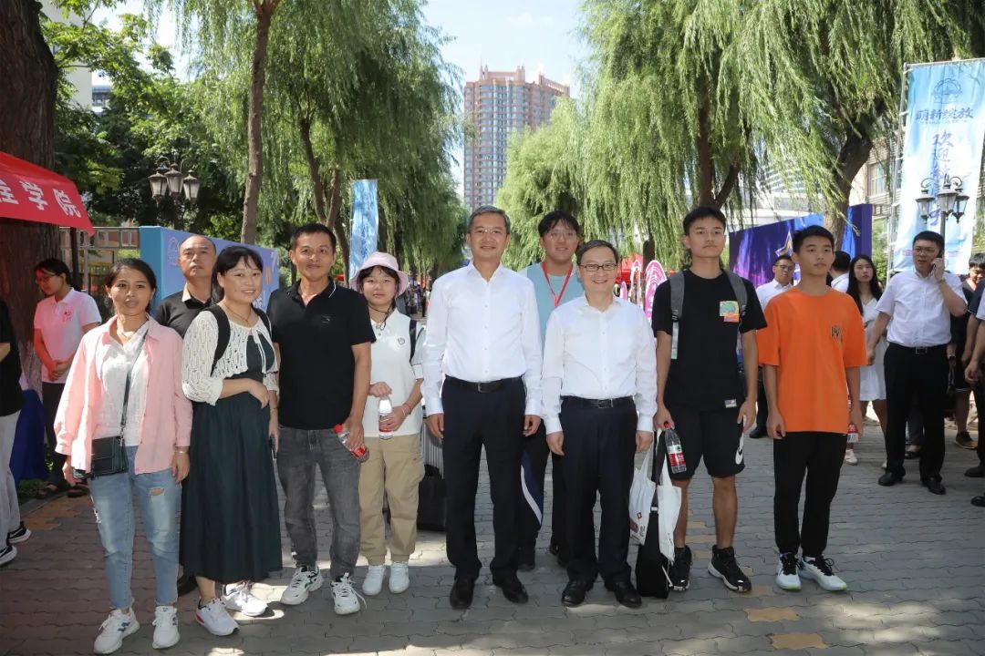 熊四皓、韩杰才一行来到一校区步行街,向各学院迎新点的工作人员仔细了解报到人数、报到流程等事项,“同学,你是哪里人?”“是家里人送你过来的吗?”在各学院迎新点熊四皓、韩杰才与新生们亲切交流,并与新生和家长合影留念。