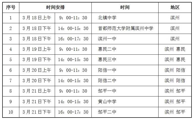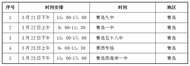 为了深入贯彻党的二十大精神,全面落实教育部相关文件要求,积极搭建学校与高中学校的桥梁,学校将于近期参加青岛、滨州地区“高校进高中”活动。请考生及家长关注每场活动的时间地点。宣传场次持续更新,请您关注“山东中医药大学招生就业处”公众号后续推文。青岛滨州★因天气等不可抗力因素导致活动安排变化,请以实际安排为准,我们会及时在学校本科招生信息网上第一时间发布通知。