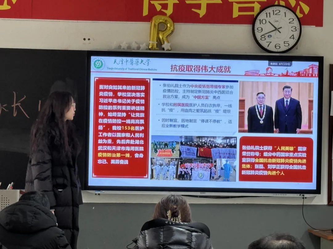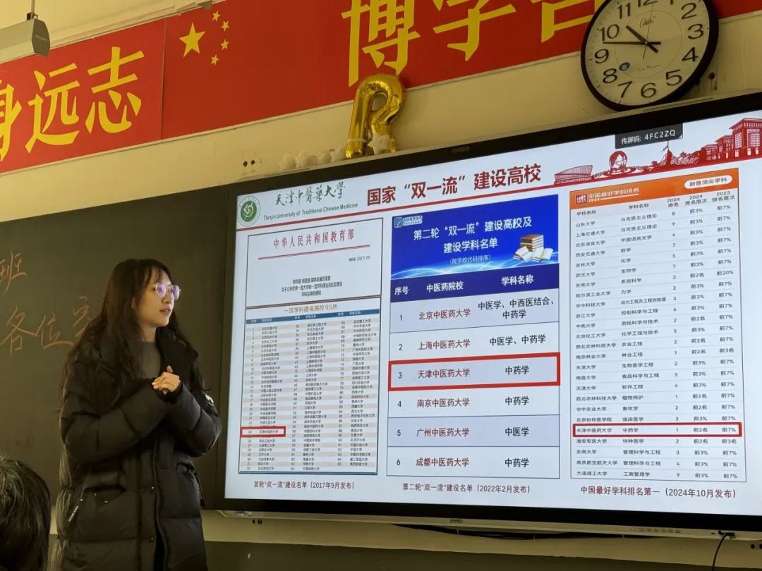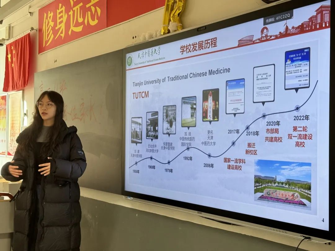 团队成员通过PPT向学弟学妹们从发展战略、办学实力、校园文化、校园政策等多个方面介绍了天津中医药大学。宣讲过程中我们聚焦于现代医药技术在中医药发展的应用展开宣讲,为学弟学妹们破除对中医药的刻板印象,激发出对中医药学习的兴趣。同时我们也以过来人的身份为学弟学妹们解读了招生政策、分享学习经验,为高三的学弟学妹们答疑解惑。在活动的最后还为各位学弟学妹们发放了中医药相关文创产品。