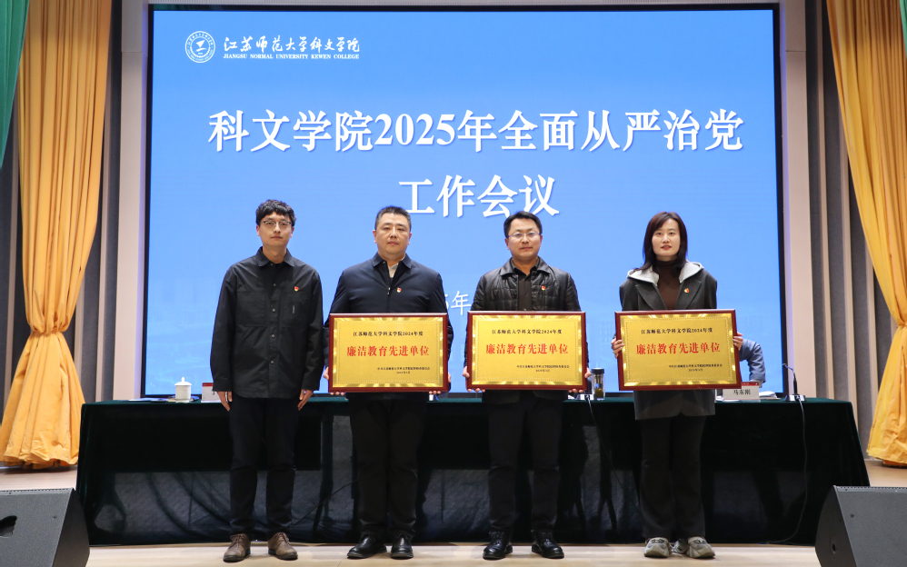 会议对2024年度廉洁教育先进单位进行表彰。院党委副书记丁力宣读表彰文件,并为传媒与设计学院党总支、人工智能与软件学院党总支、直属第二党支部等三家获奖单位颁发奖牌。