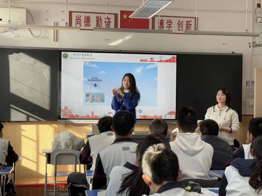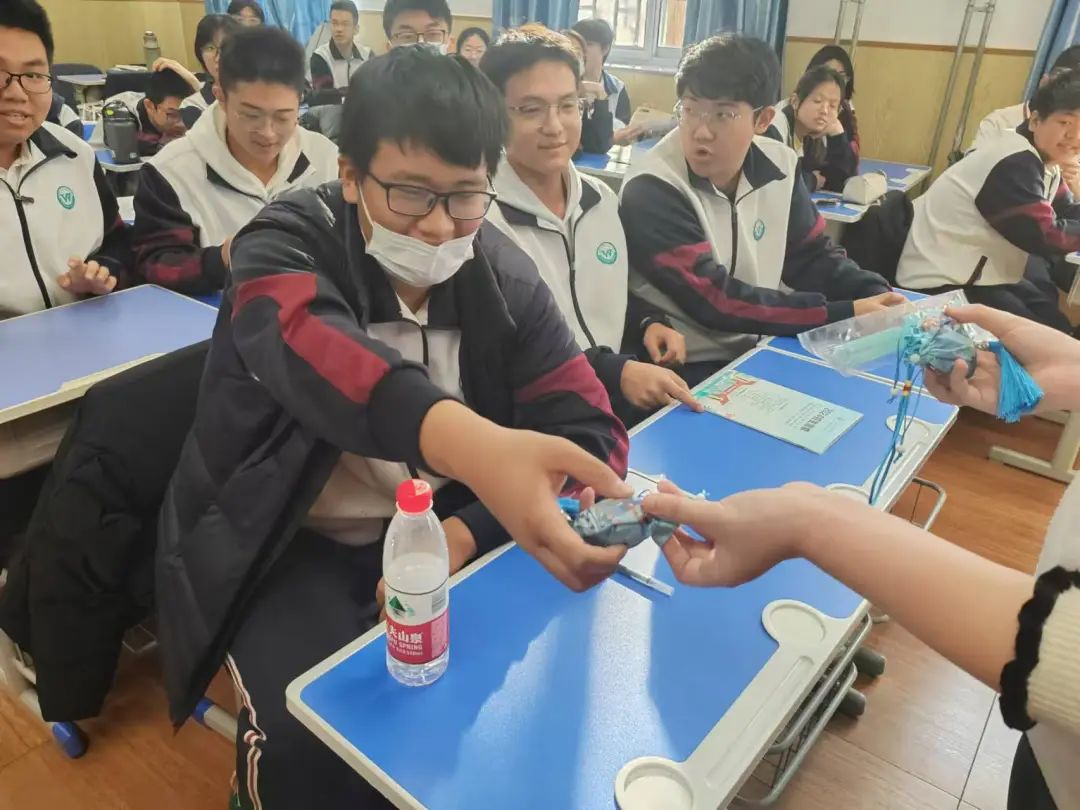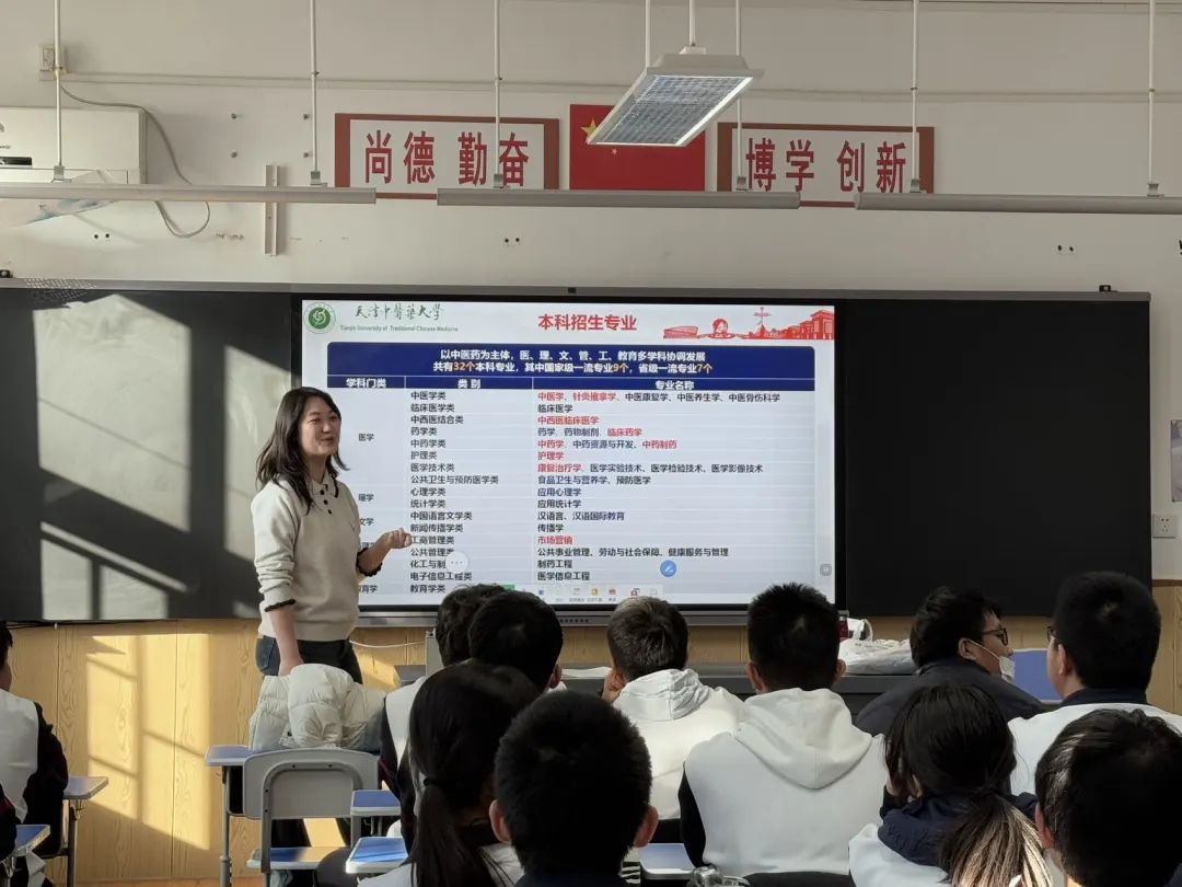 宣讲开始,负责宣讲同学直击学弟学妹们当下最关心的专业报考问题,以前期准备的PPT为辅,清晰明了的对新高考选科要求、特色专业解析、就业方向等方面进行介绍分析,用满满干货牢牢吸引住学生们的眼球。PPT上动态数据可视化展示了我校“双一流学科建设”“国家级科研平台”等硬核实力。随着PPT轮换到校园地标等图片,宣讲同学认真讲解天圆地方、人参广场、中药植物园的建筑内涵和寓意,幽默风趣的讲述社团活动中的趣事,带领大家云漫步在天中校园,感受天中丰富多彩校园生活。现场学弟学妹们热情高涨,纷纷举手提问互动,负责宣讲同学一一认真回复并分发天中特色文创物料。最后,为更好的传播中医药文化,团队成员上台为大家讲授手指放松操,随着下课铃声响起,我们宣讲团队圆满完成。