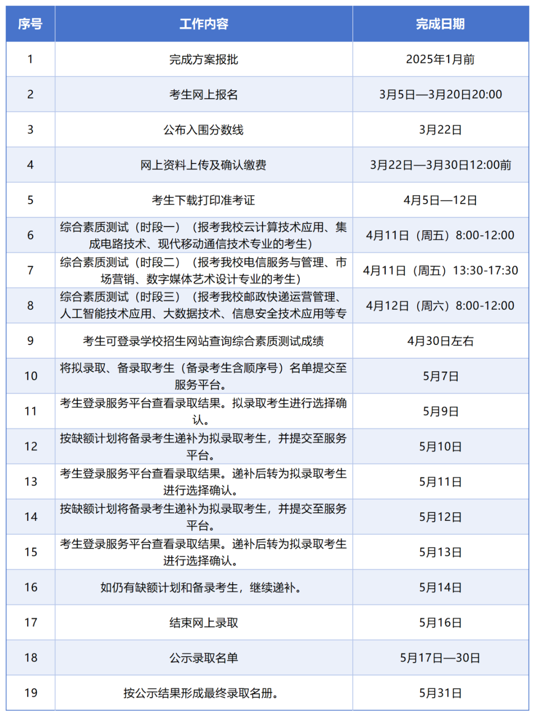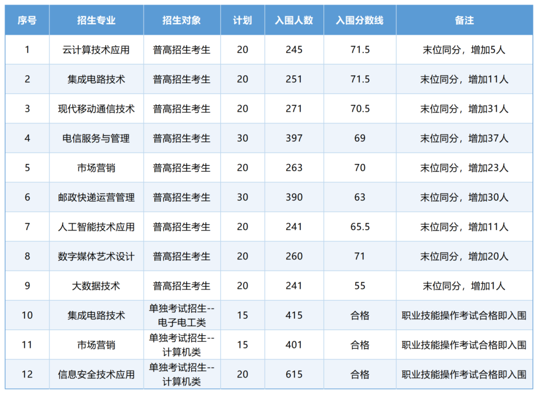 确认入围 网上确认 网上缴费我校2025年高职提前招生报名已经结束,根据《浙江邮电职业技术学院2025年高职提前招生章程》规定,学校已按普高招生考生各专业招生计划数的1200%确定综合素质测试入围考生名单(末位同分考生同时入围),报名人数不足计划数1200%的专业全部入围。单独考试招生考生的职业技能操作合格即入围。现将入围分数线、网上确认及缴费等有关事项公告如下: