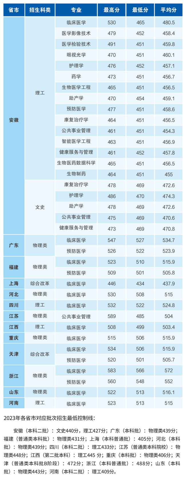 安徽医科大学临床医学院2023年分省分专业本科录取分数线