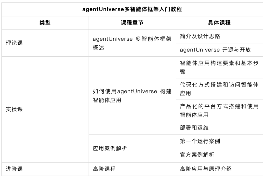 为了帮助大家快速入手,降低学习成本,我们录制了agentUniverse 多智能体框架入门教程供大家学习参考,课程包含理论课、入门课、进阶课,共 9 节,学完全部课程预计需要 100 分钟。