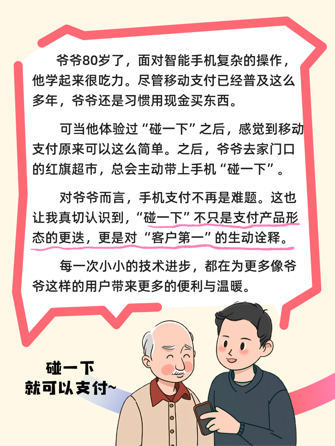“我们打造的‘碰一下’支付,是把原有的NFC 技术与最新用户体验相结合,精心打磨后,给大家带来全新支付体验。使用时,只需手机靠近支付设备,轻松就能完成交易,适合应对各种消费场景,而且支付的同时,会员积分、优惠、免单、卡片奖励等福利同步尽享。”