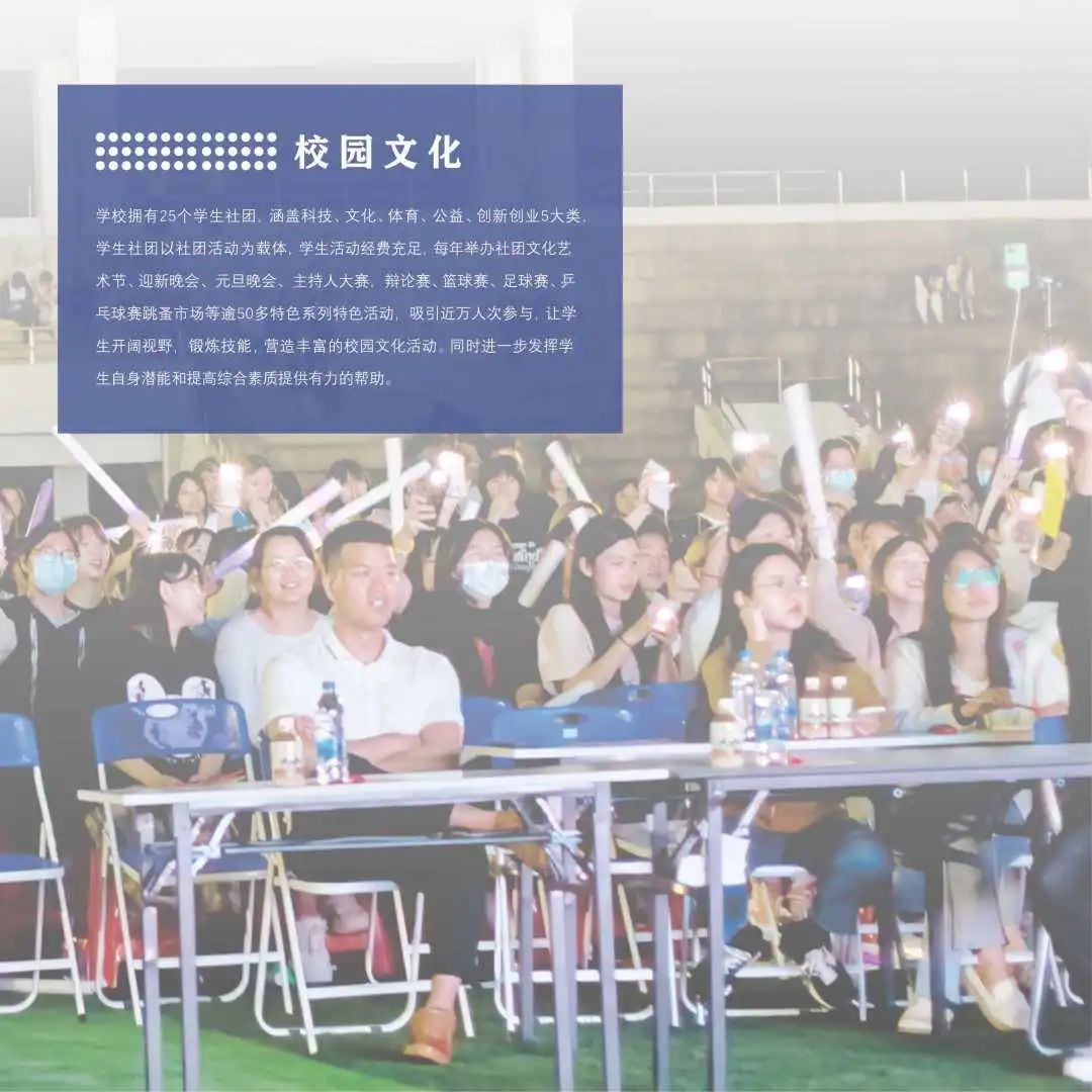学校拥有25个学生社团,涵盖科技、文化、体育、公益、创新创业5大类,学生社团以社团活动为载体,学生活动经费充足,每年举办社团文化艺术节、迎新晚会、元旦晚会、主持人大赛,辩论赛、篮球赛、足球赛、乒乓球赛跳蚤市场等逾50多特色系列特色活动,吸引近万人次参与,让学生开阔视野,锻炼技能,营造丰富的校园文化活动。同时进一步发挥学生自身潜能和提高综合素质提供有力的帮助。