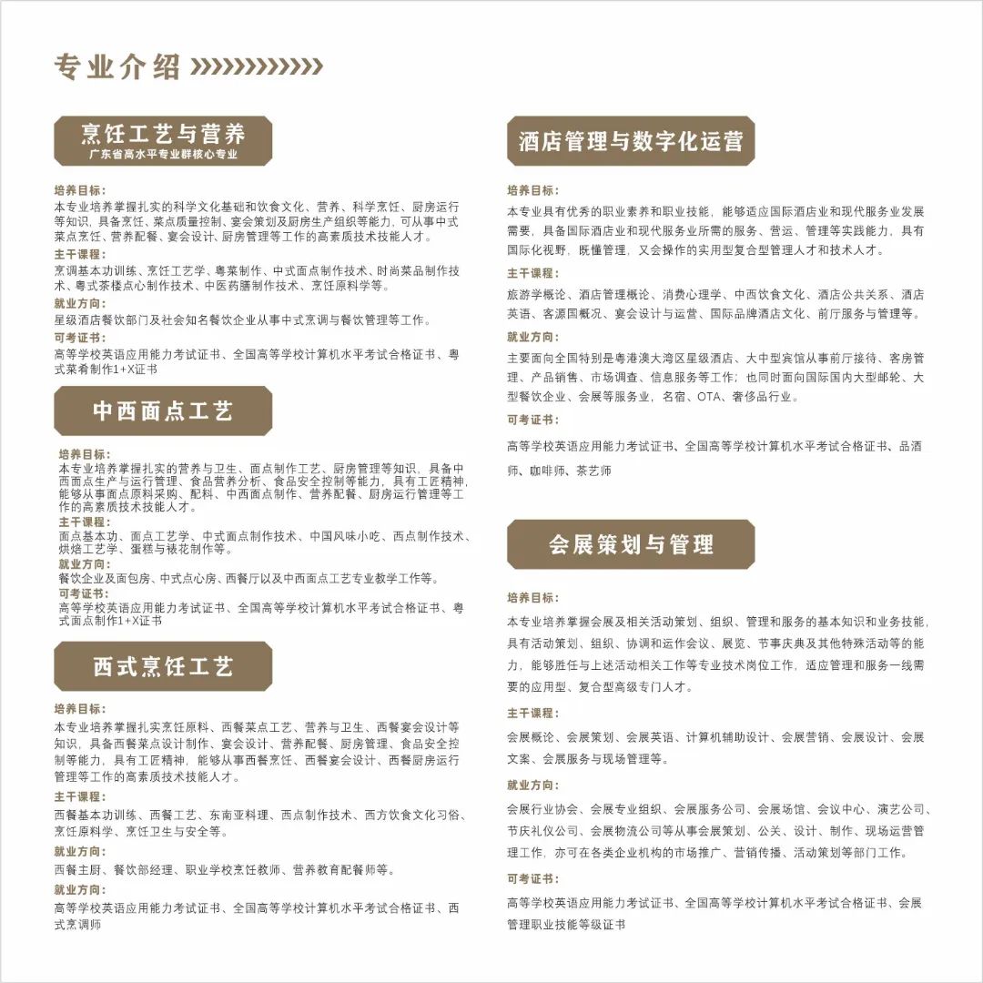 聚焦现代服务业,构建特色优势一流专业群,设有酒旅与餐饮学院、经济管理学院、智能与信息工程学院、康养与艺术学院4个二级学院,学校秉持“品牌做优、品质做强、品类做特“的专业发展思路,锚定粤港澳大湾区专业人才需求,持续构建酒店管理与数字化运营、烹饪工艺与营养、电子商务、计算机应用技术、护理等9大类专业群,形成了以2个省级高水平专业群建设为引领、5个校级品牌和1个特色专业不断共同发展的态势,有效对接粤港澳大湾区高端产业和产业高端。