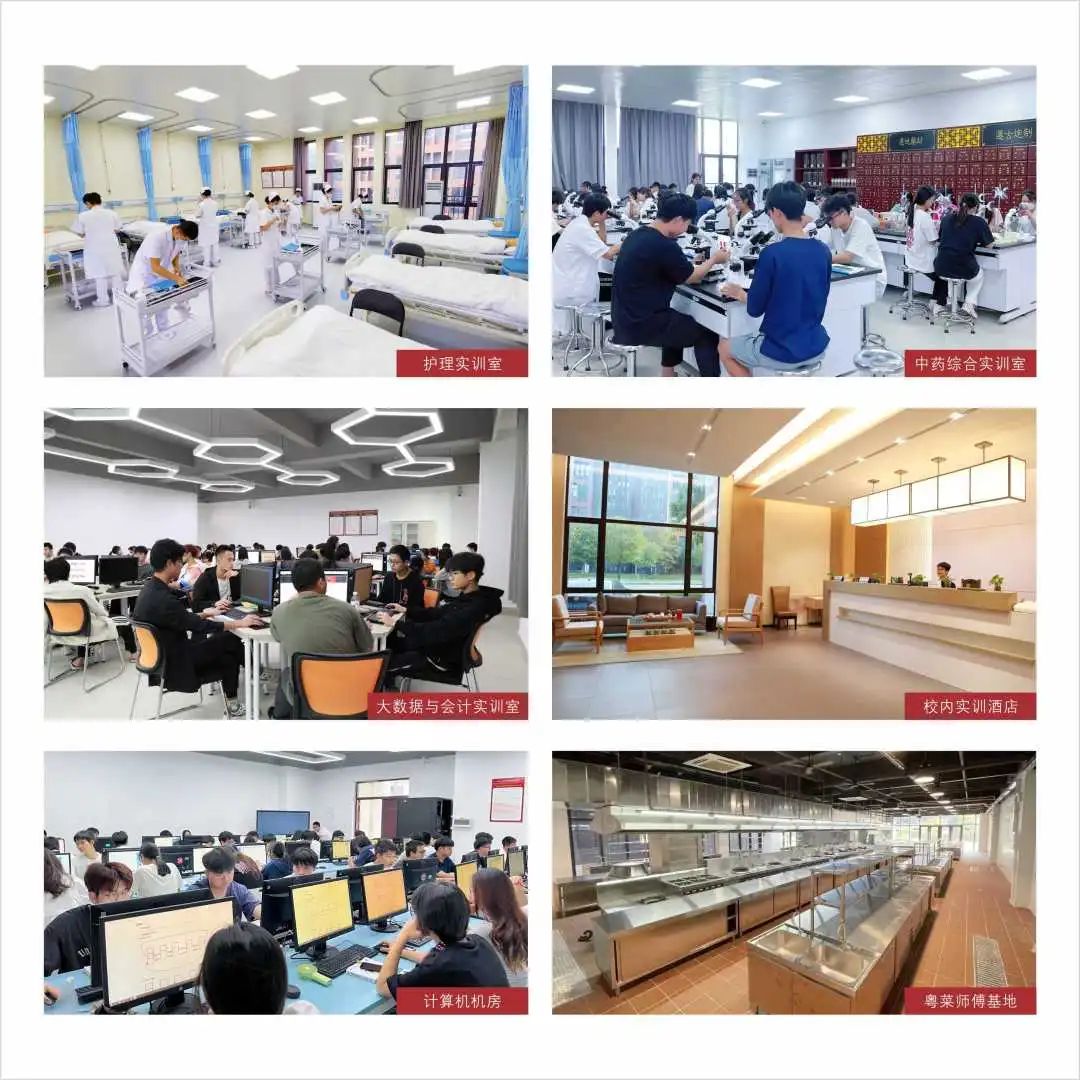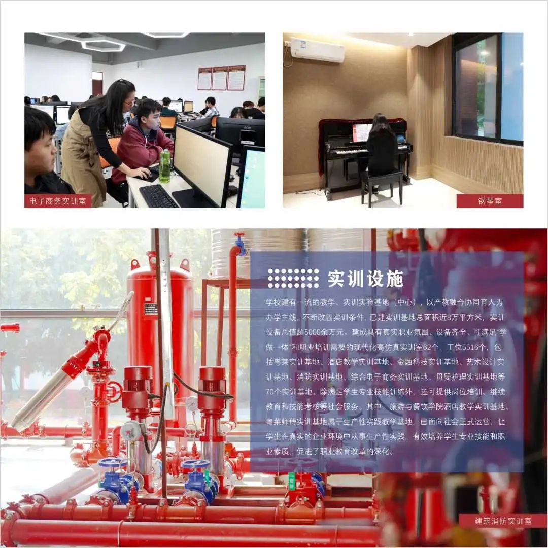 学校建有一流的教学、实训实验基地(中心),以产教融合协同育人为办学主线,不断改善实训条件,已建实训基地总面积近8万平方米,实训设备总值超5000余万元。建成具有真实职业氛围、设备齐全、可满足“学做一体”和职业培训需要的现代化高仿真实训室62个,工位5516个,包括粤菜实训基地、酒店教学实训基地、金融科技实训基地、艺术设计实训基地、消防实训基地、综合电子商务实训基地、母婴护理实训基地等70个实训基地。除满足学生专业技能训练外,还可提供岗位培训、继续教育和技能考核等社会服务。其中,旅游与餐饮学院酒店教学实训基地、粤菜师傅实训基地属于生产性实践教学基地,已面向社会正式运营,让学生在真实的企业环境中从事生产性实践,有效培养学生专业技能和职业素质,促进了职业教育改革的深化。