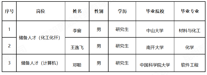根据昆明醋酸纤维有限公司《招聘管理制度》有关要求,经过资格审查、笔试、面试、体能测试、体检和考察等程序,确定3人为公司储备人才岗位拟聘用人员,现予以公示。公示期间对聘用人员如有异议,请向昆明醋酸纤维有限公司纪检监察部门反映。