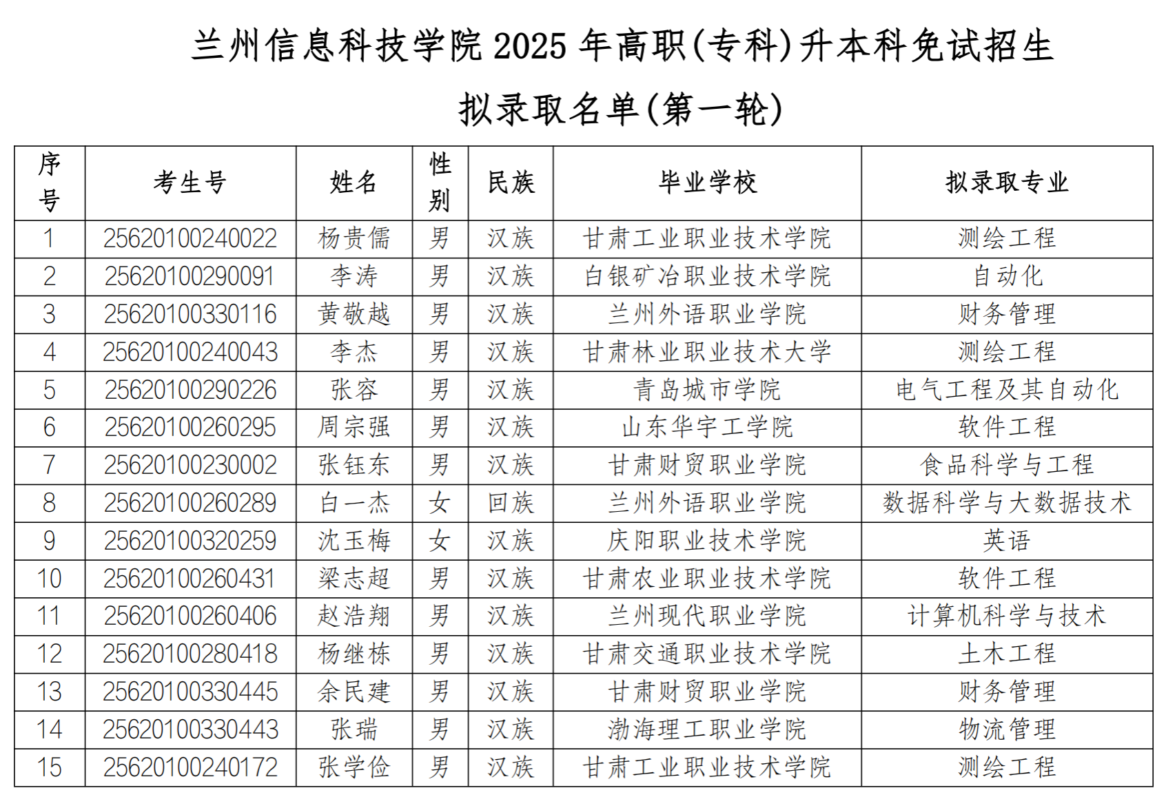 兰州信息科技学院 2025 年高职(专科)升本科免试招生拟录取名单公示(第一轮 )