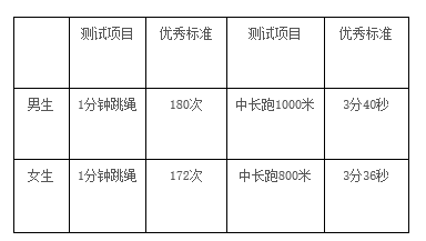 3、体质测试项目包括1分钟跳绳、中长跑(男生1000米、女生800米),优秀标准为: