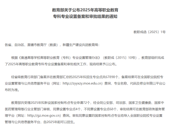 近年来,随着高等教育的普及,高职教育日益受到关注。2025年,中国高职教育领域经历了一次显著的调整。日前,教育部对于高职专业的审批结果引起了广泛关注。在这一年,教育部共受理了72个拟新设国家控制布点专业的申请,但最终仅同意设置4个专业点,不同意设置专业点68个。(审批结果详情:2025年新设高职专科国家控制布点专业审批结果)这一结果直接表明了教育部在高职教育专业设置上的严格把关和对教育质量的高标准要求,同时反映出高职教育正在经历一次重大的变革。