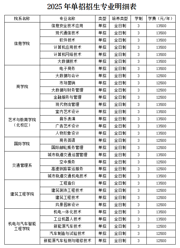 2025年学校单独考试招生专业及计划见附表,技能拔尖人才免试录取考生计划单列执行,学校可视报考情况,调整招生计划。