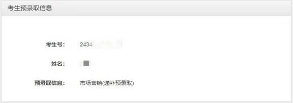 点击“预录取信息”按钮,将出现以下界面。预录取信息表示考生已被递补预录取的专业名称。如未出现专业名称等信息,则表示未被递补预录取。
