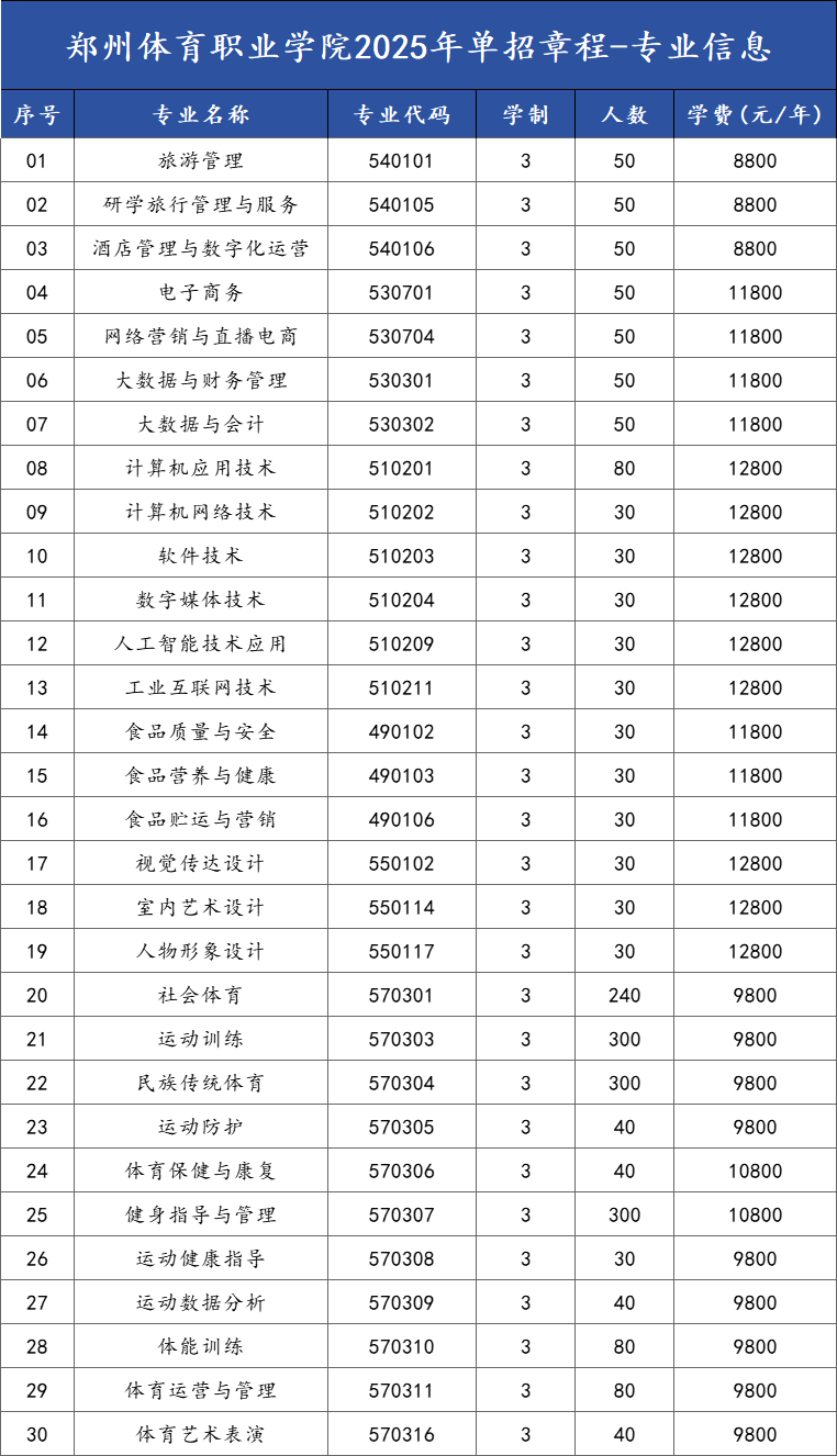 我校按照河南省教育厅、财政厅、发展和改革委员会物价部门批准的收费标准进行收费,定为:旅游管理、研学旅行管理与服务、酒店管理与数字化运营8800元/生/学年;运动训练、社会体育、体育运营与管理、民族传统体育、运动防护、运动数据分析、运动健康指导、体能训练、体育艺术表演9800元/生/学年;健身指导与管理、体育保健与康复10800元/生/学年;大数据与会计、网络营销与直播电商、大数据与财务管理、电子商务、食品营养与健康、食品质量与安全、食品贮运与营销11800元/生/学年;计算机应用技术、计算机网络技术、软件技术、数字媒体技术、人工智能技术应用、工业互联网技术、视觉传达设计、室内艺术设计、人物形象设计12800元/生/学年。