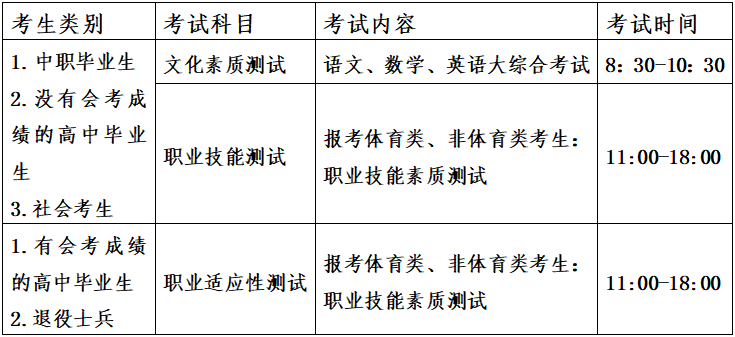 (二)职业适应性测试(职业技能测试):总分200分。报考体育类专业考生职业技能测试项目为 100 米和立定跳远,每项100分,总分200分;报考非体育类专业考生进行职业适应性测试:采取面试的形式,总分200分,主要考察考生的语言表达能力、创新思维能力、分析和解决问题的能力。
