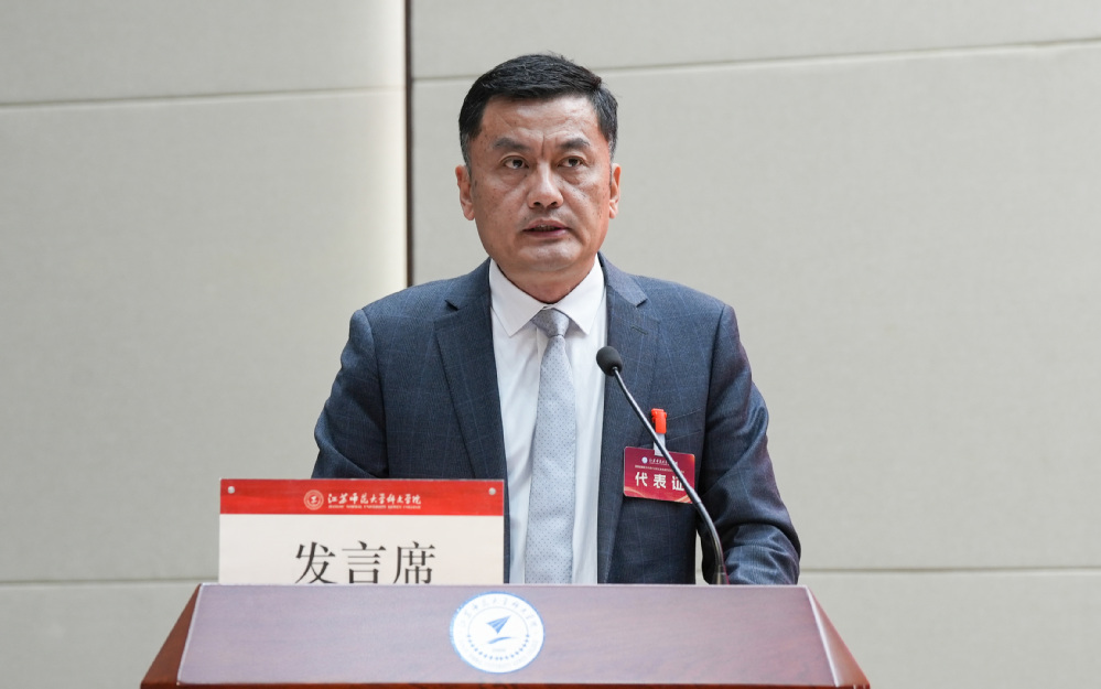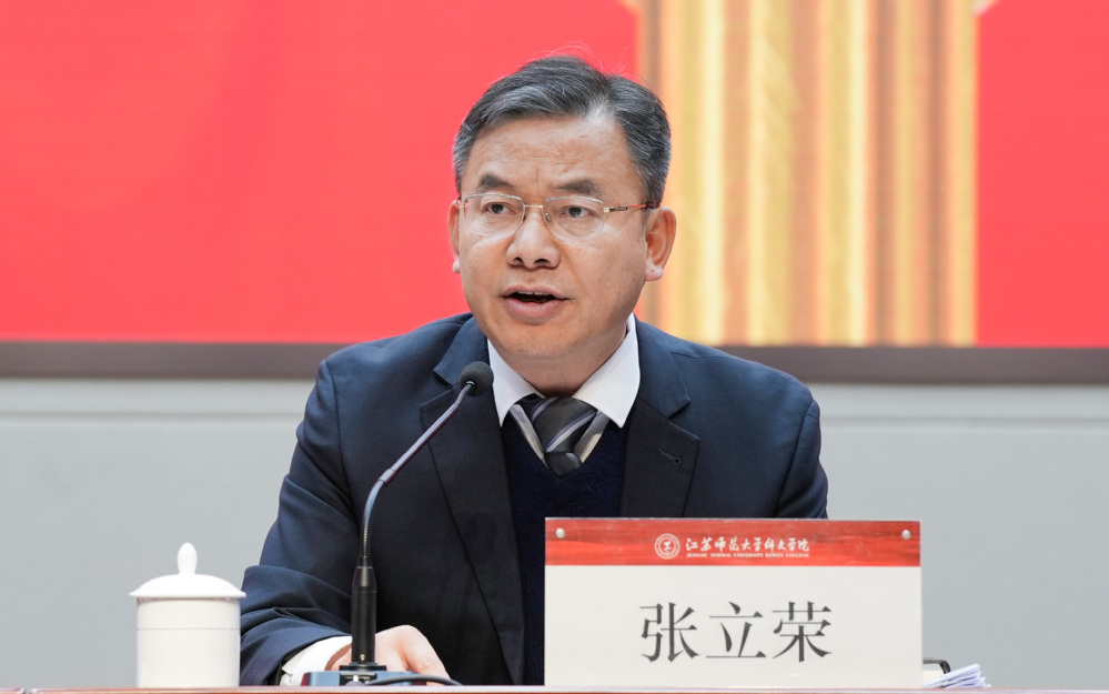 院党委书记张立荣讲话。他指出,此次大会既是一次成绩总结会也是一次工作部署会,既是一次形势分析会也是一次事业推进会,对于加快推进学院高质量发展具有重要指导意义。各位代表密切联系学院实际,以“躬身谋局”的担当精神,“群策群力”的协作意识,为学院改革发展献智聚力,充分彰显了爱校荣校的赤诚之心和推动高质量发展的实干精神。张立荣表示,胡福年院长的工作报告全面回顾总结了过去一年学院各项工作取得的新成就,并就2025年的工作重点和工作举措进行了明确和阐释,切实达到了统一思想、振奋精神、明晰任务的预期效果。为贯彻好本次会议精神,做好今年乃至今后一段时间学院工作,他提出五点意见:一是要讲政治,以高质量党建引领事业发展航向;二是要讲创新,以改革动能激发育人活力;三是要讲纪律,以法治思维构建治理体系;四是要讲安全,以底线思维筑牢校园平安屏障;五是要讲民主,以共建共享凝聚发展合力。张立荣最后强调,师生发展好,科文才会好,科文发展好,师生会更好,学院从来都是改革创新的实干热土,希望全体教职员工要“仰望星空”谋事、“脚踏实地”理事、“激情燃烧”干事,内抓管理、外争资源,善谋善思、善作善成,要勇担奋进之责、锤炼实干之风、激发创新之能、彰显实干之效,在建设国内知名、省内一流应用型学院新征程上贡献新的更大力量。