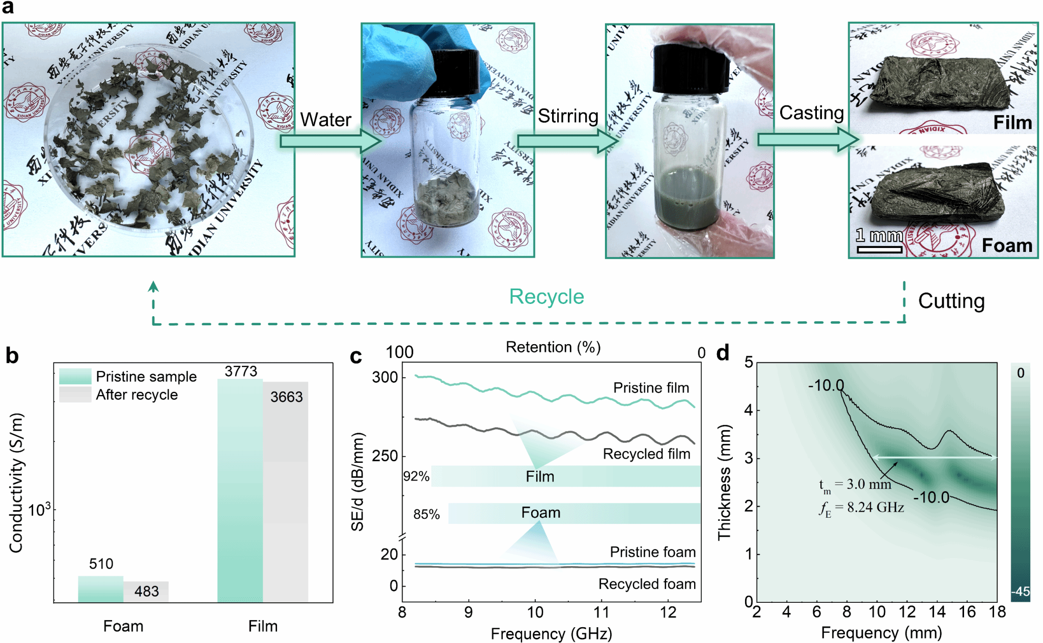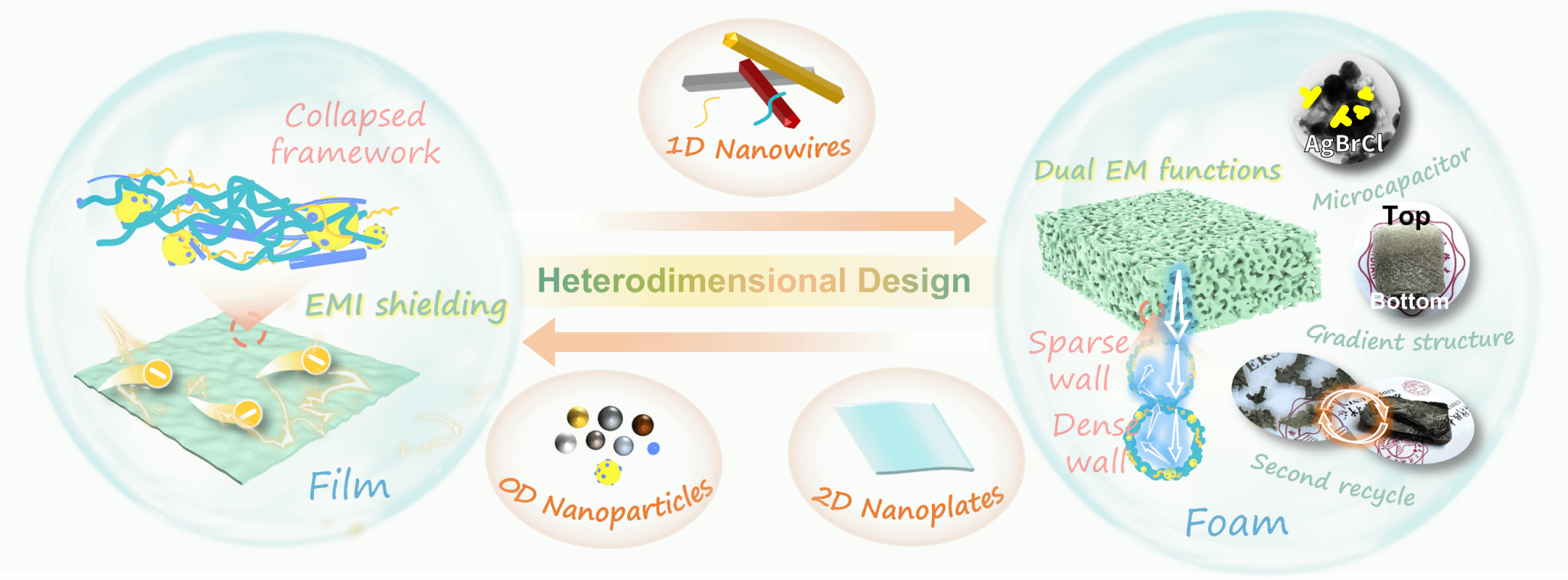 西电新闻网讯(通讯员常晶晶)近日,郝跃院士团队常晶晶教授课题组相关研究成果以“Electromagnetic Functions Modulation of Recycled By-products by Heterodimensional Structure”为题,发表在《Nano-Micro Letters》(影响因子:31.6)上,集成电路学部在读博士生南泽为第一作者,魏葳高工、新加坡国立大学OuyangJianyong教授以及常晶晶教授为共同通讯作者,西安电子科技大学为第一署名单位。西北工业大学李贺军院士、袁瑞梅博士对本工作给予了重要支持。 随着电子器件不断向微型化发展,3D集成技术成为提升器件密度的关键路径之一。该技术通过垂直堆叠器件或芯片,进一步推动了高性能集成电路的发展。然而,3D集成技术也引入了电磁干扰挑战(包括近场耦合效应和串扰噪声等问题),影响了集成系统的信号完整性,从而对系统的可靠性和稳定性构成了威胁。在这一背景下,基于纳米材料的电磁防护材料因其突出的电磁损耗能力、柔韧性以及多样化的维度特性,为解决电磁干扰问题提供了新的方向。其中,银纳米线作为一种性能优异的电磁功能材料,因其超高的长径比、优异的本征柔性以及卓越的金属导电性而备受关注。然而,目前采用主流的多元醇法合成银纳米线时不可避免地产生大量多维副产物。这些过滤后的副产物材料尚未得到有效利用,其潜在的环境风险(如纳米填料的生物毒性)、降解困难以及回收利用的技术瓶颈等问题,仍然是制约其资源化应用的主要障碍。 针对上述问题,西安电子科技大学郝跃院士团队常晶晶教授课题组首次提出利用银纳米线副产物的异维结构构建形态可调的气凝胶材料。通过精确设计异维纳米结构,“化腐朽为神奇”,团队成功实现了微波与材料之间的高效相互作用,不仅保留了纳米银材料的高导电性和电磁响应特性,还为异维纳米材料电磁性能的调控提供了全新思路。该研究为开发多功能电磁材料开辟了新途径,同时为银纳米线副产物的高效回收与资源化利用提供了切实可行的解决方案。 在该项研究中,团队利用冷冻干燥工艺,借助混合纤维素(包含细菌纤维素和纤维素纳米纤维)-银纳米线网络辅助,利用不同异维结构中的毛细力差异,成功制备了两种不同形态的气凝胶:气凝胶薄膜和气凝胶泡沫。气凝胶薄膜展现出较好的电磁屏蔽性能(SE > 89 dB);气凝胶泡沫则表现出双重电磁功能,包括屏蔽效能(SE > 30 dB)以及微波吸收性能(反射损耗RL < -35 dB,宽频吸收特性EAB > 6.7 GHz)。 本研究表明,银纳米线副产物中天然形成的卤化银与表面随机合成的银晶体,共同构建了“Ag-AgBrxCl1-x-Ag”纳米微电容结构。这一独特结构显著增强了入射电磁波的极化损耗,实现了以吸收为主导的屏蔽机制,从而大幅降低了电磁波的反射。此外,研究团队基于孔隙流体向凝胶表面结晶层迁移过程中低迁移速度诱导的“AgBrxCl1-x-NanoAg”聚集体沉积现象,设计了相应的填料体系,使副产物气凝胶自上而下形成电导梯度,显著优化了表面阻抗匹配特性,在实现高效电磁屏蔽的同时,也为微波吸收创造了条件。 进一步,研究团队通过常温机械搅拌将废弃的副产物气凝胶重新分解为均匀的纤维素-副产物浆料,使其作为二次回收材料实现循环加工利用。基于纤维素与聚乙烯吡咯烷酮之间通过范德华力、氢键和静电相互作用形成的弱物理交联作用,气凝胶展现出优异可回收性——其纳米导电网络整体保持完整,导电性与电磁功能基本维持初始水平,为绿色电磁功能材料“闭环式”循环体系的构建提供了新思路。 本工作通过制备多种电磁功能气凝胶,验证了AWBps升级回收方法的有效性。所制备的气凝胶利用异维结构实现了对微波相互作用的灵活调控。研究系统分析了不同异维纳米材料气凝胶的形态特征,并展示了其可调的电磁防护性能,包括电磁屏蔽效能和双重功能。此外,二次回收的气凝胶在电磁防护性能上几乎保持不变,体现了绿色“闭环式”循环的特点。该工作不仅深化了对微波-异维结构耦合机制的理论认知,更为开发动态可调谐的绿色电磁功能材料(如应用于智能可穿戴设备)提供了创新途径。 该研究工作得到国家重点研发计划、国家自然科学基金、中国科协青年人才托举工程博士生专项计划、中央高校基本科研业务费专项资金、2023年度秦创原建设两链融合重大专项、陕西省重点研发计划、广东省基础与应用基础研究基金以及西北工业大学凝固技术国家重点实验室开放课题、浙江省太阳能利用及节能技术重点实验室开放基金课题等科研项目的资助。 论文信息: Ze Nan, Wei Wei*,ZhenhuaLin,RuimeiYuan, Miao Zhang, Jincheng Zhang, Jianyong Ouyang*,JingjingChang*,HejunLi, Yue Hao. Electromagnetic Functions Modulation of Recycled By-Products by Heterodimensional Structure. Nano-Micro Lett. 17, 137 (2025). https://doi.org/10.1007/s40820-025-01659-7 论文链接: https://link.springer.com/article/10.1007/s40820-025-01659-7#additional-information 责任编辑:史倩云
