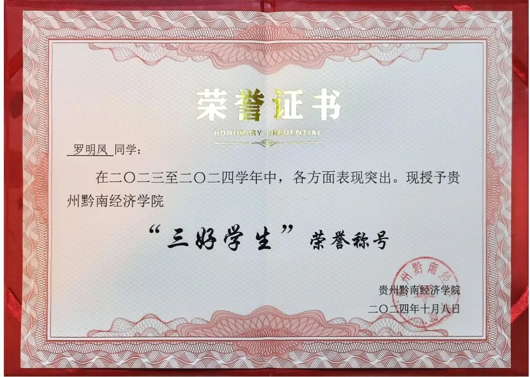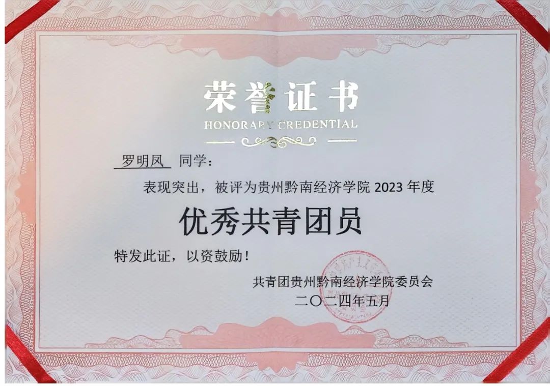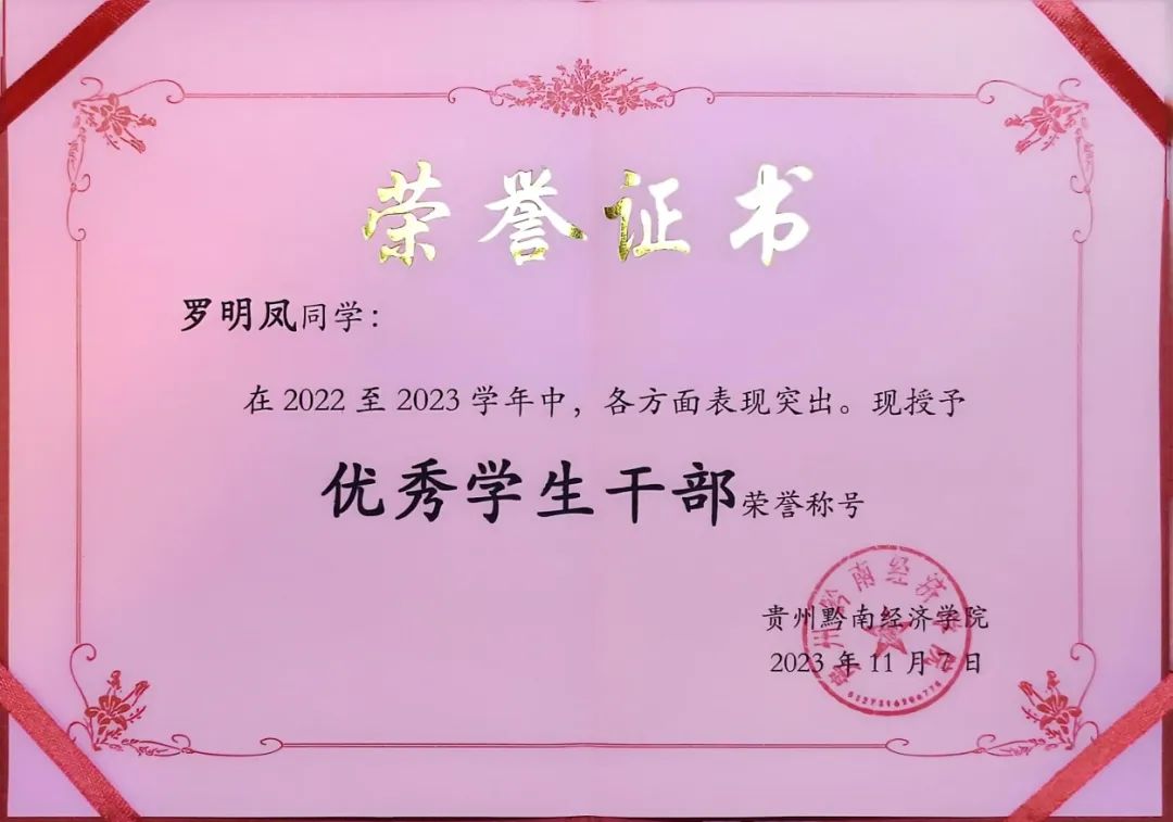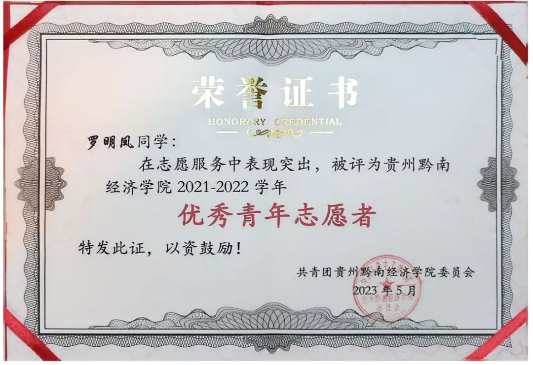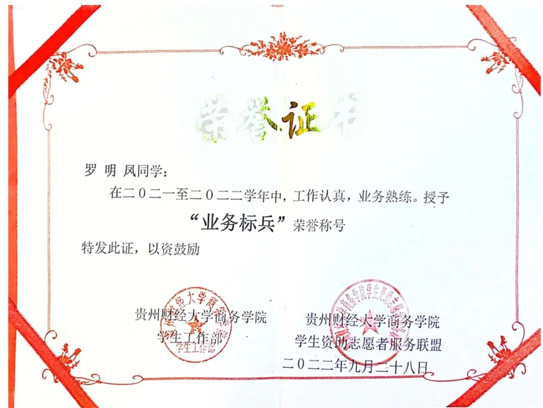 罗明凤部分荣誉证书担任学生资助志愿者服务联盟部长期间注重部门文化建设通过团建活动增强团队凝聚力和归属感建立完善的激励机制激发成员的工作积极性和创造力在此当中个人的组织协调能力、应变能力也获得了显著提升,不负时光,给自己的学习答卷丰富的课外活动和事务几乎占据了她每天的学习时间,尽管有时感到十分疲惫,但她并未选择退缩和放弃为了平衡学业与课外活动她常通过早起来确保学习任务不耽误,这种坚持不仅让她的生活变得充实也使得她在各方面都有所收获