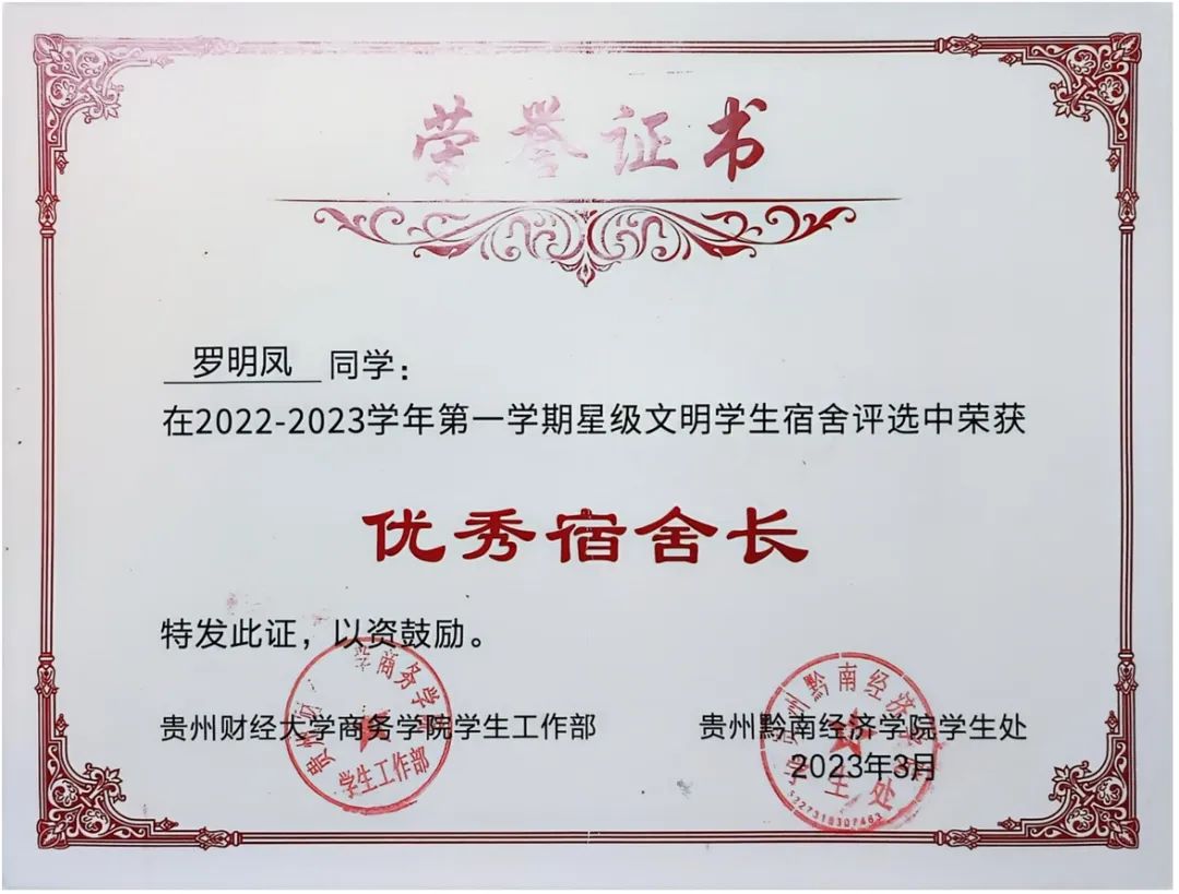 她会主动与同学进行沟通交流,了解他们的真实想法和原因其中因事疏忽的同学她会耐心地进行相关提醒说明安全工作的重要性有特殊情况的同学她会根据实际情况调整安排与其协商解决方案建立信任关系,相互尊重和关心,作为宿舍长负责宿舍日常管理事务罗明凤积极的组织动员宿舍成员进行卫生管理、安全管理、宿舍文化建设......在学校星级宿舍评选中所在宿舍连续四次获得“五星级寝室”称号个人四次荣获“优秀宿舍长”称号