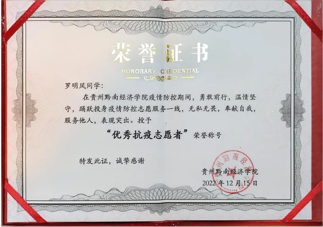 罗明凤部分荣誉证书“明确学习目标,合理安排时间,掌握学习方法”关于学习,她总结道“大一年级前19%,大二年级前2%,大三年级前0.7%”这是她交出的学习答卷,保持热心,最生动的大学课程罗明凤也是校园志愿活动的“常客”,迎新、疫情防控、校园宣讲会、校园网络维护... ...对于她来说,志愿服务就是最生动的大学课程