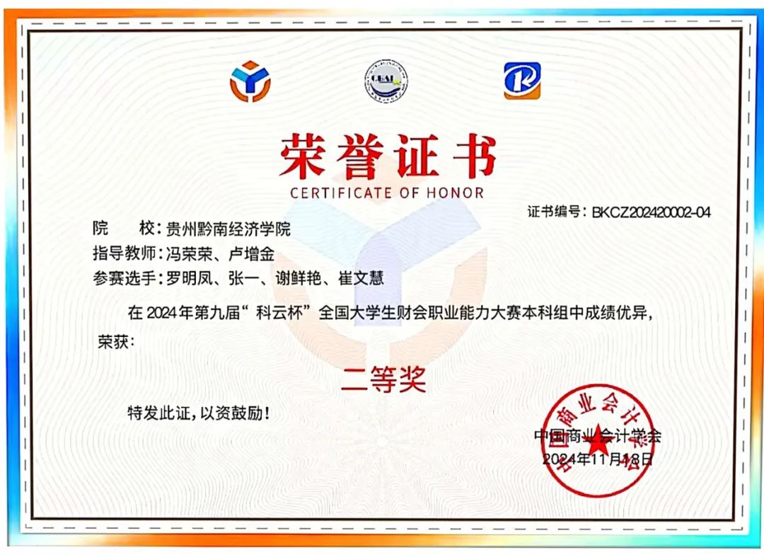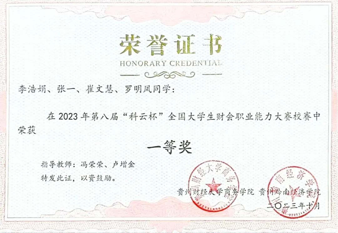 罗明凤贵州黔南经济学院会计学院会计学2106班安全委员曾获校级三好学生、优秀学生干部业务标兵、优秀宿舍长等荣誉称号科云杯”全国大学生本科组财会职业能力大赛省级二等奖全国本科院校税收风险管控案例大赛省级三等奖“科云杯”财会职业能力大赛校级一等奖等竞赛荣誉