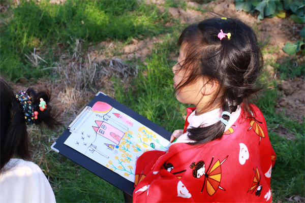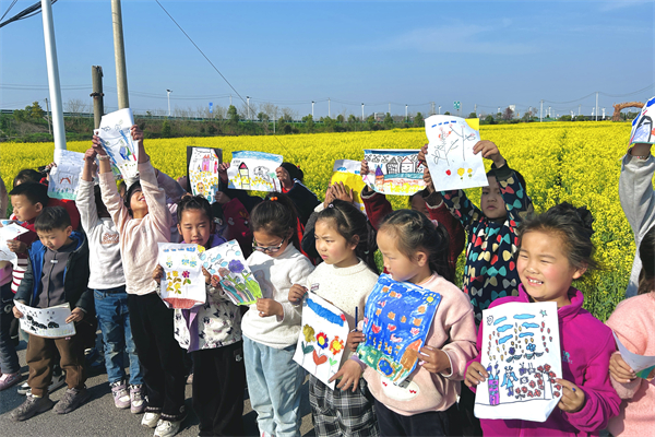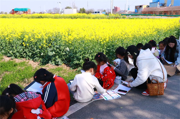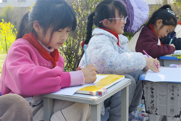 “在田边上美术课太有意思啦!”“感觉画出来的画比平时漂亮好多!”孩子们全神贯注地挥动手中的画笔,将色彩大胆地涂抹在画纸上,仿佛要把眼前这片绚丽春光一股脑儿“装”到画里。不一会儿,一幅幅充满童趣、洋溢着生机的春日画卷在画纸上晕染开来。孩子们看着自己的作品,兴奋得小脸通红,七嘴八舌地嚷着,直说在户外上美术课“新鲜又好玩!”