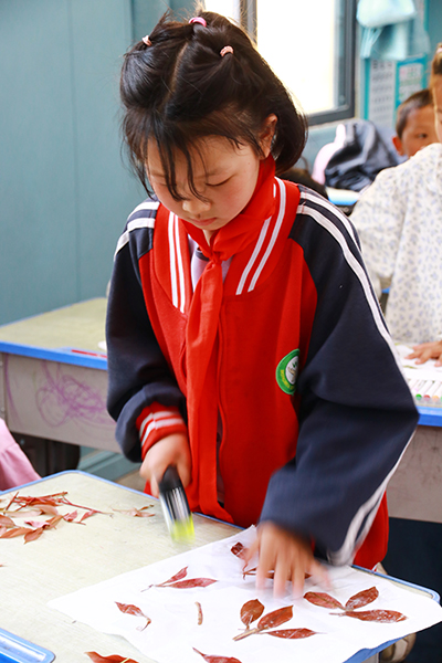 “我把春天印在手帕上了。”“我要把春天送给妈妈。”在志愿者的示范下,孩子们小心翼翼地把油菜花、树叶等放在手帕上,然后缓缓地抚平叶子,再拿起小锤子,专注地轻轻敲打,一下又一下,动作温柔极了,生怕把“春天”的美弄坏了似的。