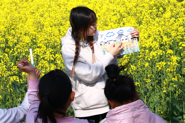 金黄的油菜花、翠绿的草地、错落有致的村庄、湛蓝的天空……在田野里,孩子们在志愿者的悉心指导下,把质朴的小板凳当作画板,将无垠的大自然当作巨幅画布,纷纷拿起五彩画笔,面向一望无际的春光,在嬉笑打趣中开启了一场奇妙的创作之旅。