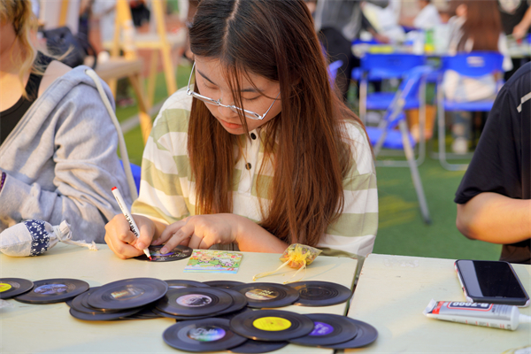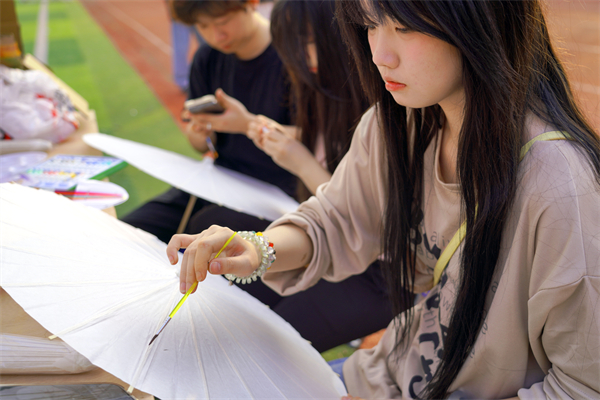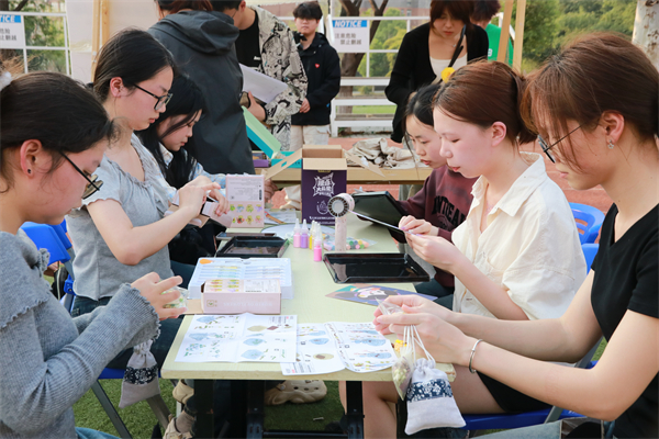 17时许,各学院精心布置的互动摊位前汇聚了熙熙攘攘的人群。创意手工区,同学们正低头绘制“植物拓印”、组装“玻璃许愿瓶”,或小心翼翼地将各种香料放入特制香囊,在专注创作中沉淀思绪、感受宁静。一旁的游戏互动区也备受青睐,“趣味扭扭车”你追我赶惊喜不断,“撕掉标签”用文字信息传递心情,“彩绘油纸伞”考验团队默契……同学们参与热情高涨,各个打卡点人气火爆,操场上洋溢着欢声笑语。