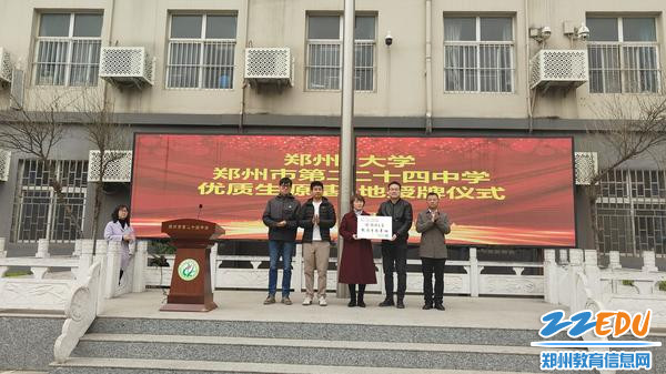 3月27日上午,郑州大学“优质生源基地”授牌仪式在郑州市第二十四中学举行。我校郑州招生组、美术学院副教授薛峰,郑州市第二十四中学党委书记常玉霞、校长郭鹏参加授牌仪式。