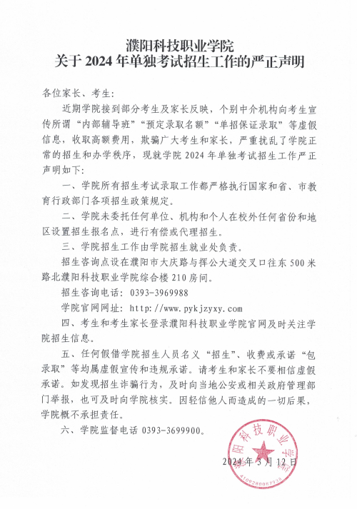 濮阳科技职业学院关于2024年单独考试招生工作的严正声明