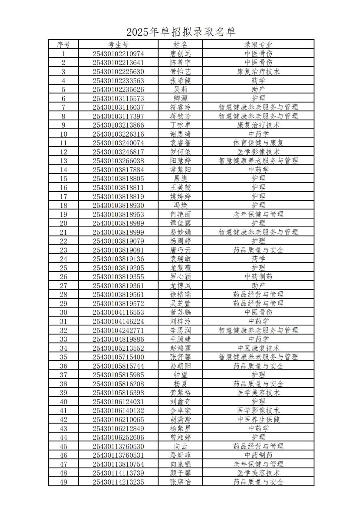 根据湖南省教育厅、湖南省教育考试院有关文件要求和《湖南中医药高等专科学校2025年高职单招章程》《湖南中医药高等专科学校2025年艺术、体育特长生高职单招方案》的规定,我校将2025年单招拟录取名单报省教育考试院核查通过,现将拟录取名单及各类别考生的录取分数线予以公示,公示时间:2025年3月26日-4月1日。