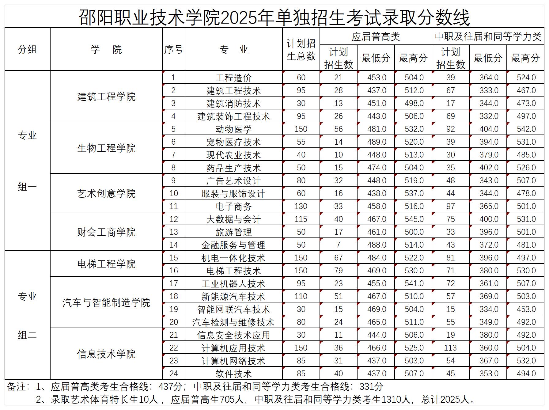 按照湖南省单独招生录取原则和《邵阳职业技术学院2025年单独招生章程》,我校2025年单独招生考试录取分数线和录取名单经湖南省教育考试院审核通过。现将2025年单独招生考试各类别、各专业录取分数线及录取名单予以公示,公示期:2025年3月24日至3月31日,考生如有异议,请与我校单独招生领导小组反映,联系电话:0739-5301616、8902153。