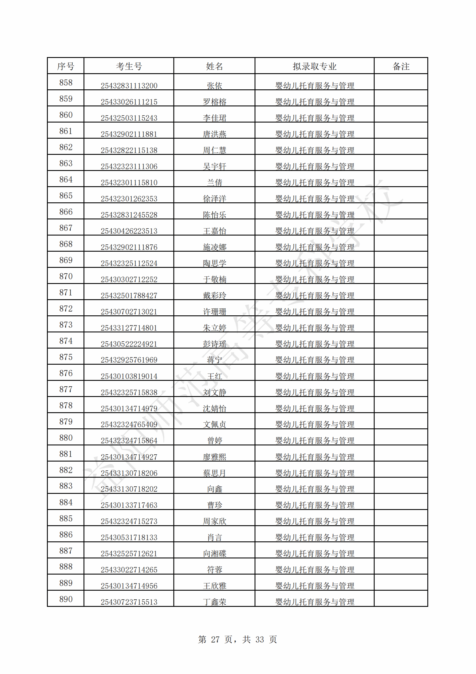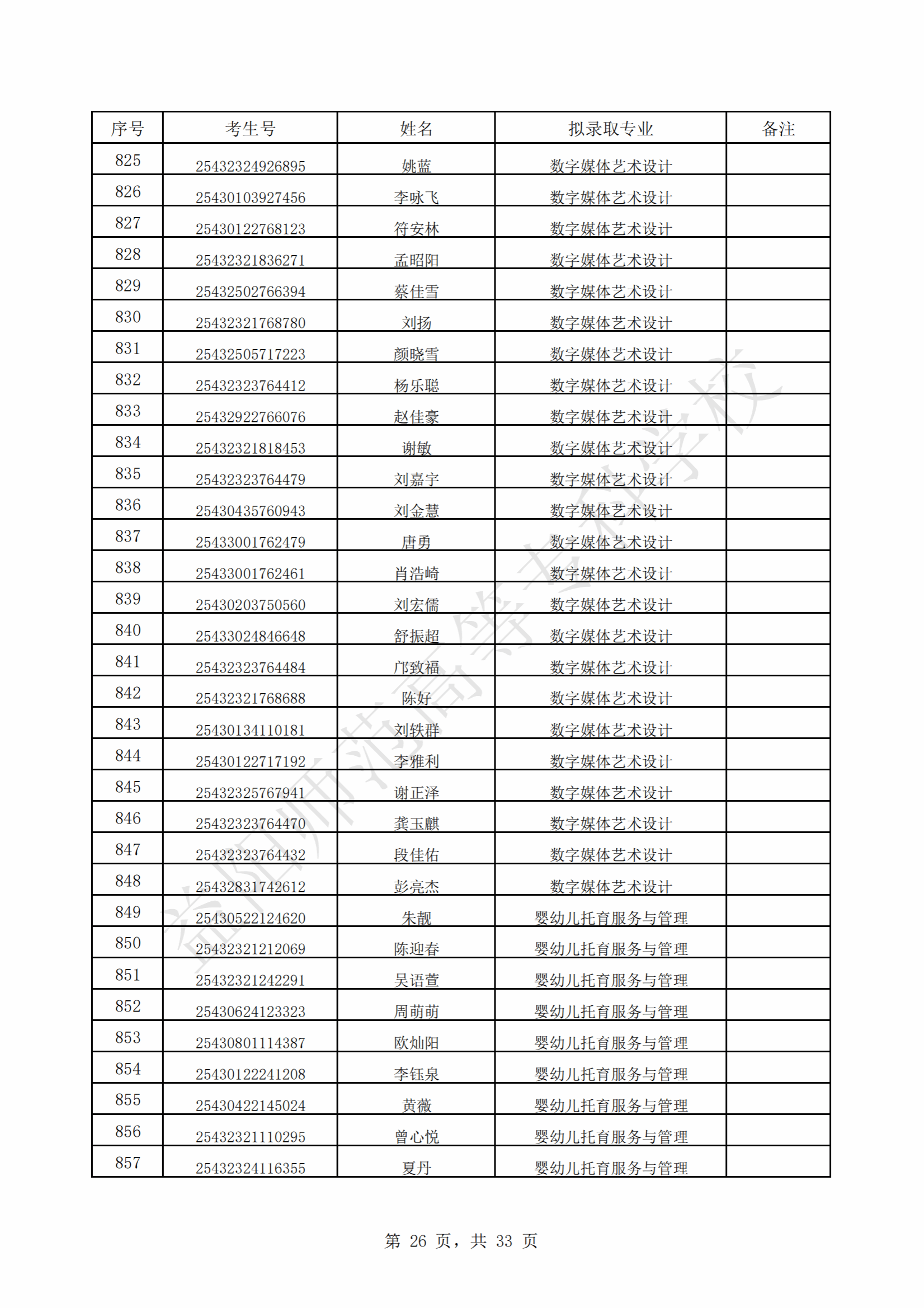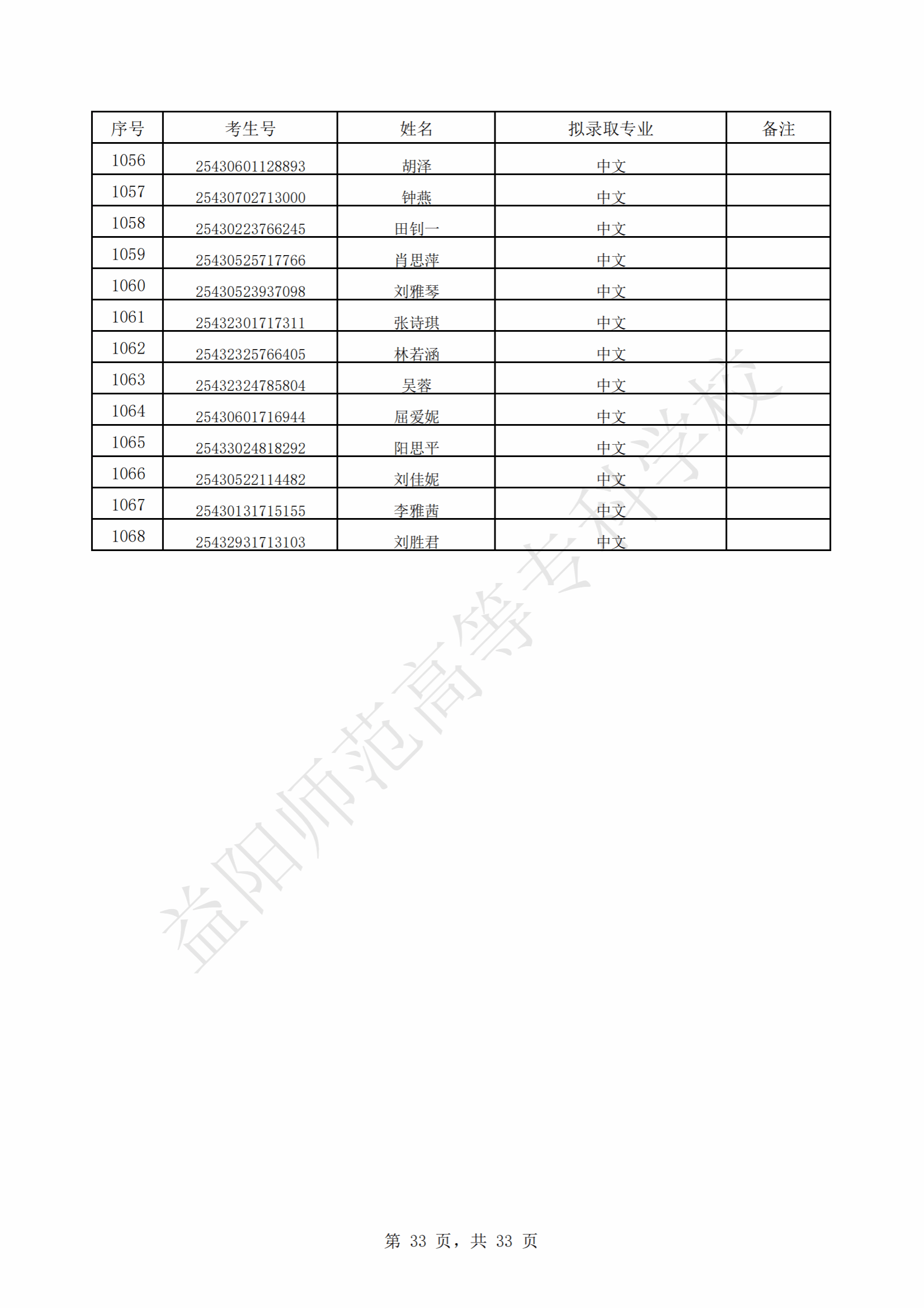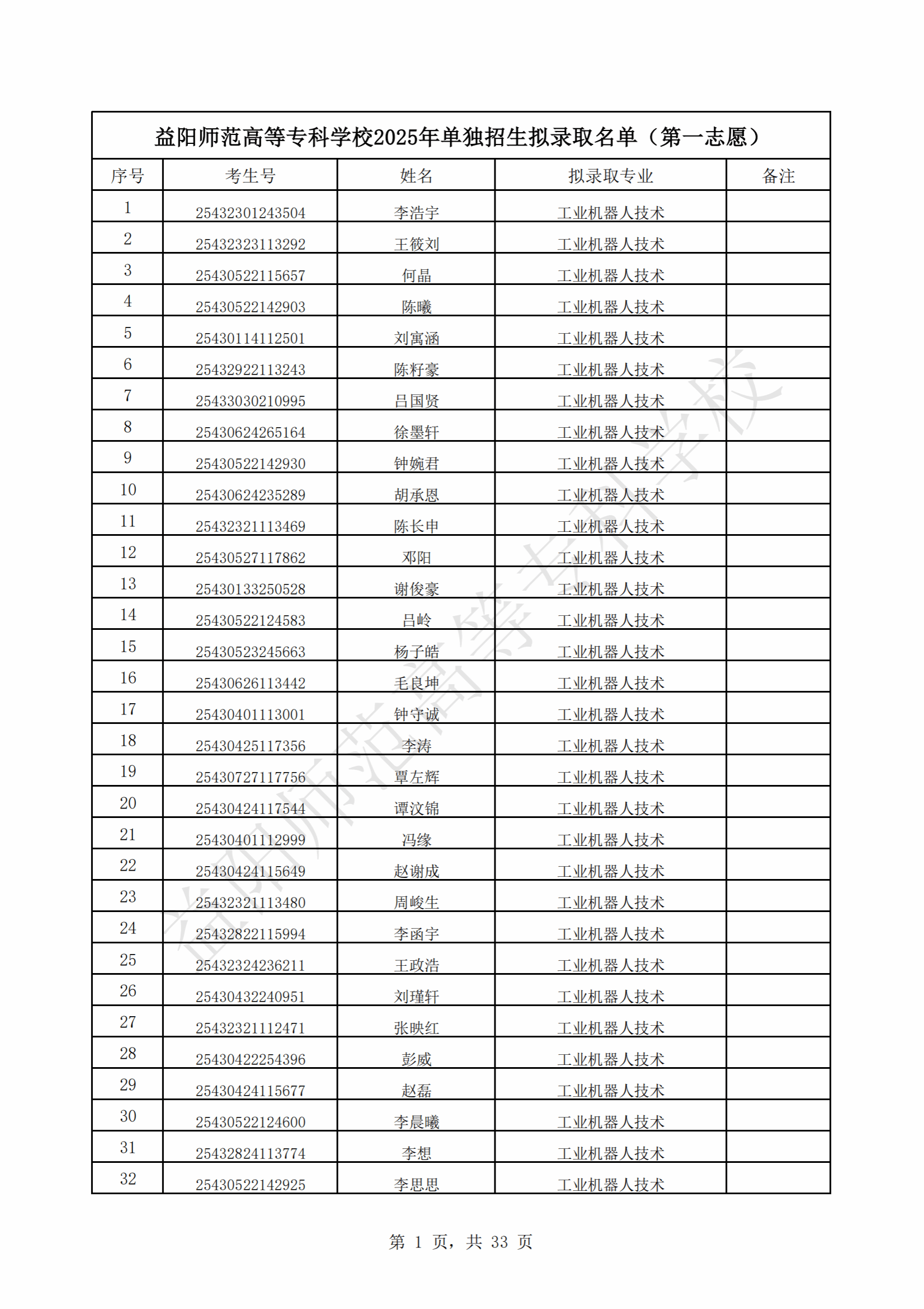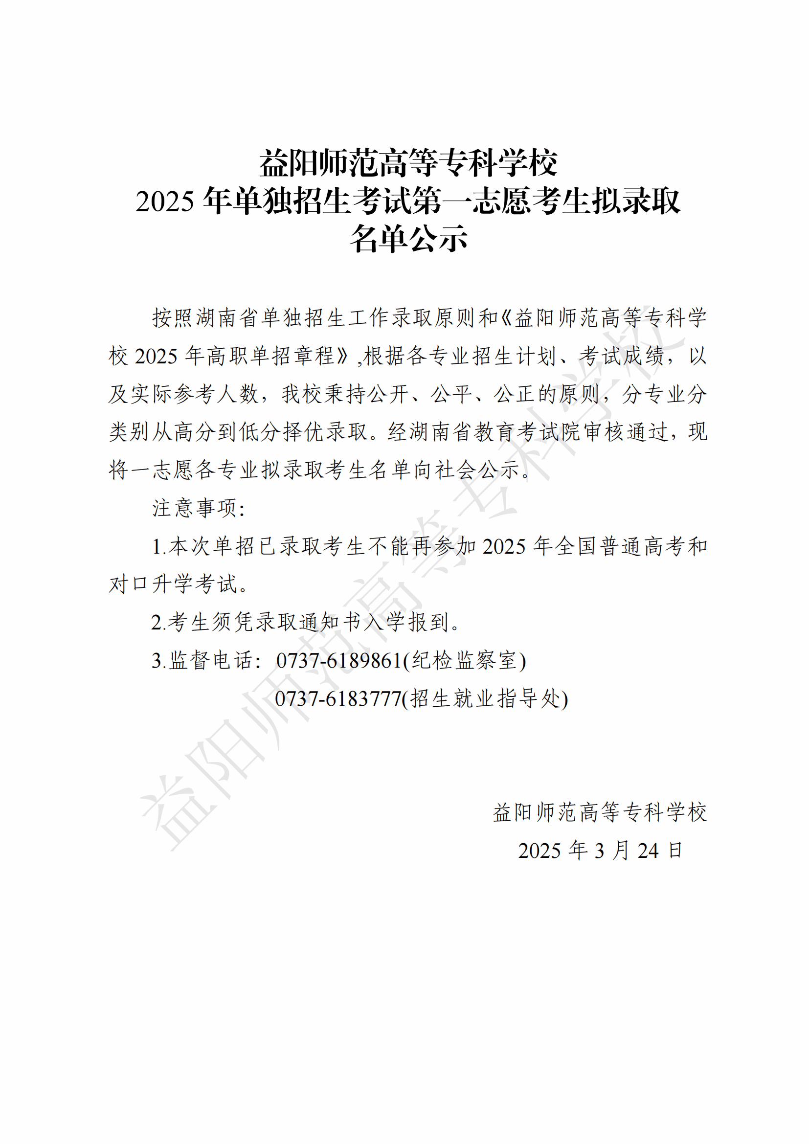 益阳师范高等专科学校2025年单独招生考试第一志愿考生拟录取名单公示