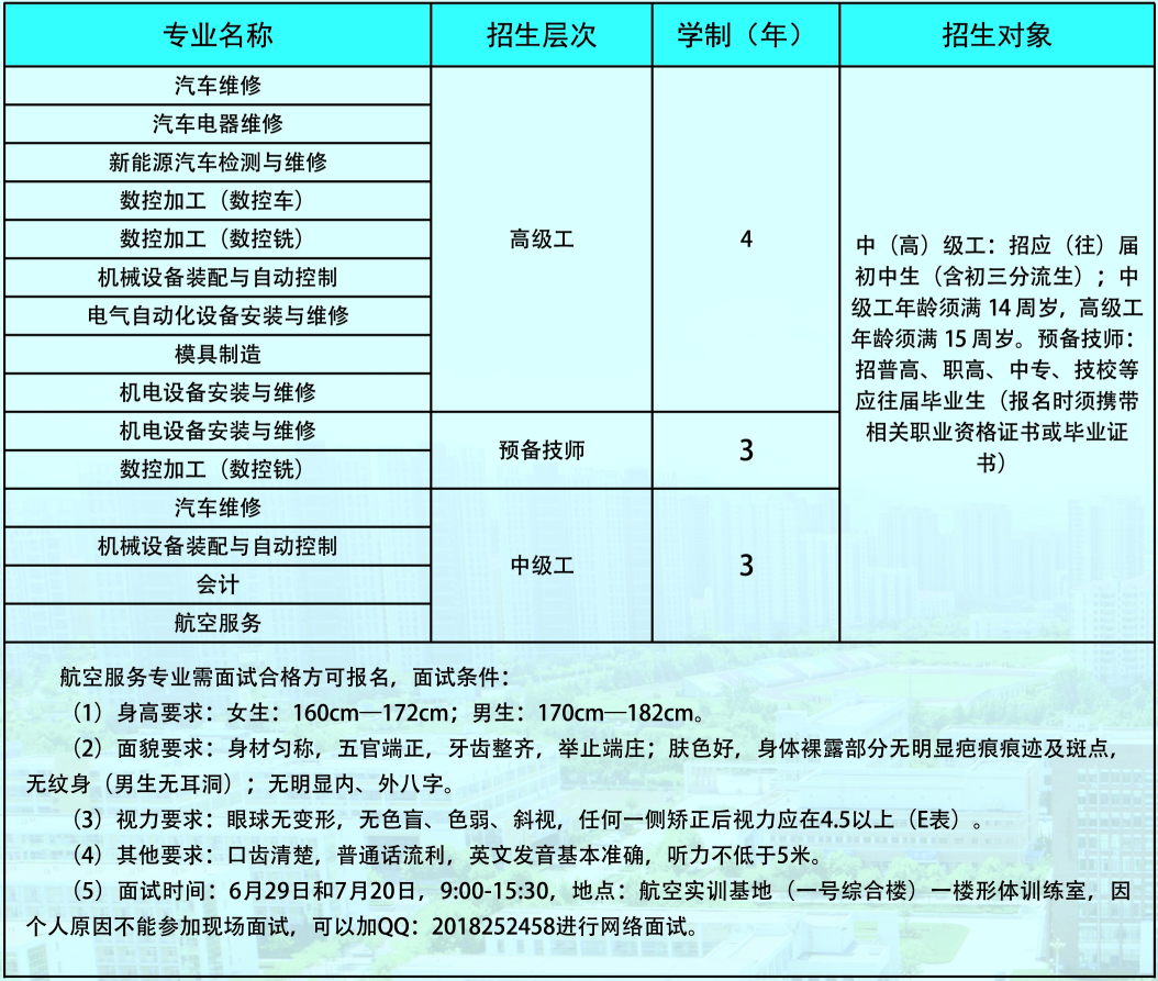 【培养目标】航空服务专业采用“3+3”的培养模式。前3年系统学习旅游服务类专业所需的基础理论、专业理论及部分实训课程,第3学年学院组织学生参加本院单招考试或春季高考,考试合格后录取到我院空中乘务或国际邮轮乘务管理专业大专班。培养具有较高政治素质及专业素养,具备良好的外语听、说沟通能力,有灵活地协调和应变能力;能熟练掌握民航服务/邮轮乘务理论和基本技能,能够适应企业发展需要,服务于企业一线的高素质技术技能型人才。