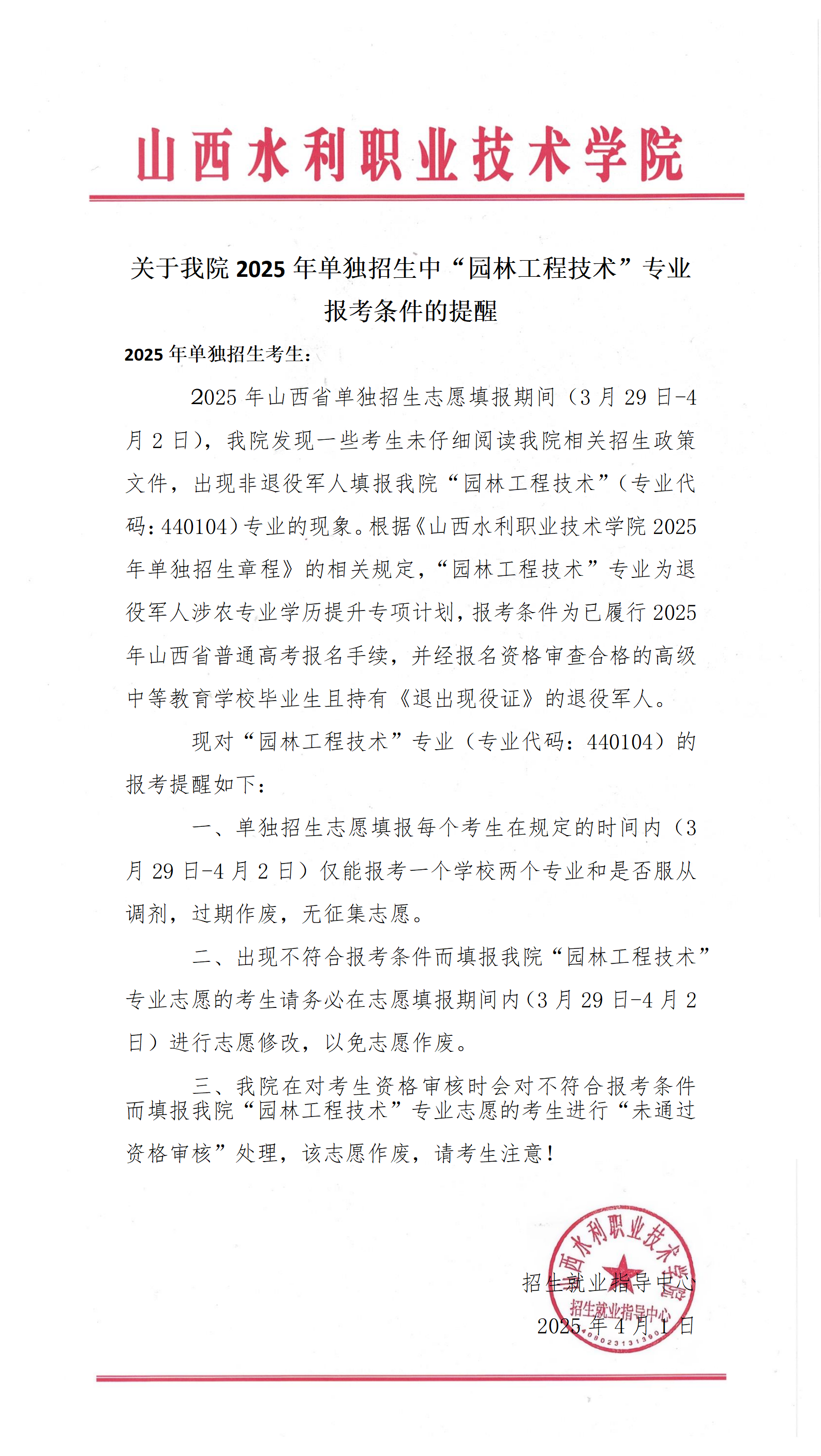 关于我院2025年单独招生中"园林工程技术"专业报考条件的提醒